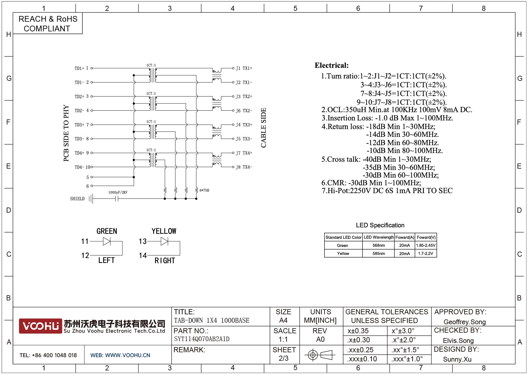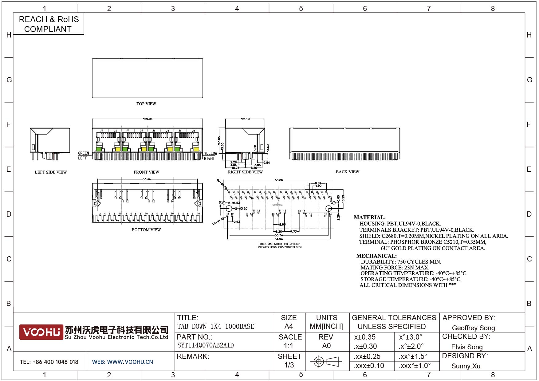 SYT114Q070AB2A1D 90° 侧面插入 1*4 开口朝下 100/1000M LED G/Y DIP RJ45