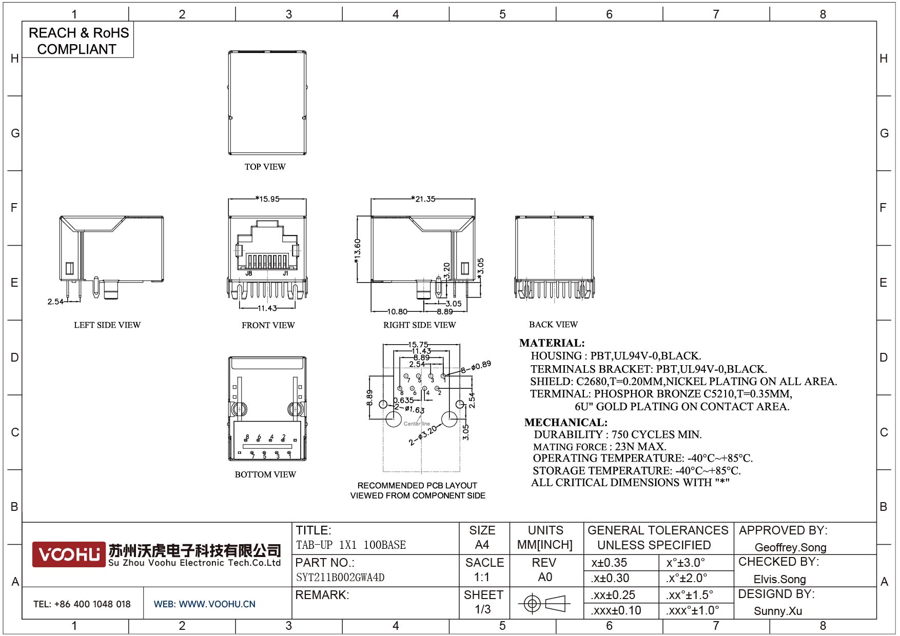 SYT211B002GWA4D 90° 侧面插入 1*1 开口朝上 10/100M 无LED DIP RJ45