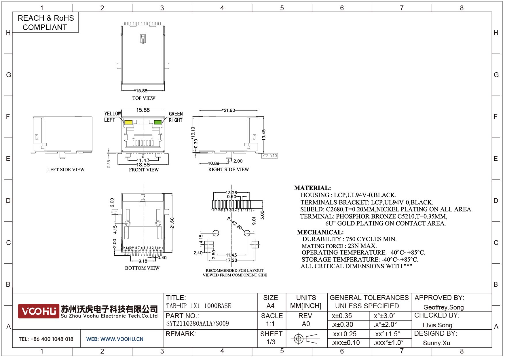 SYT211Q380AA1A7S009 90° 侧面插入 1*1 开口朝上 100/1000M LED Y/G SMT RJ45