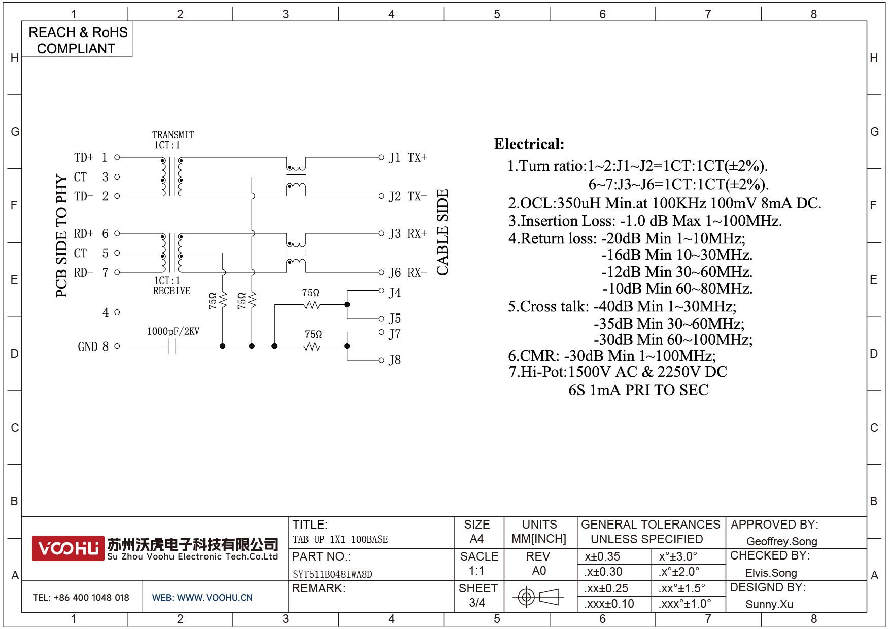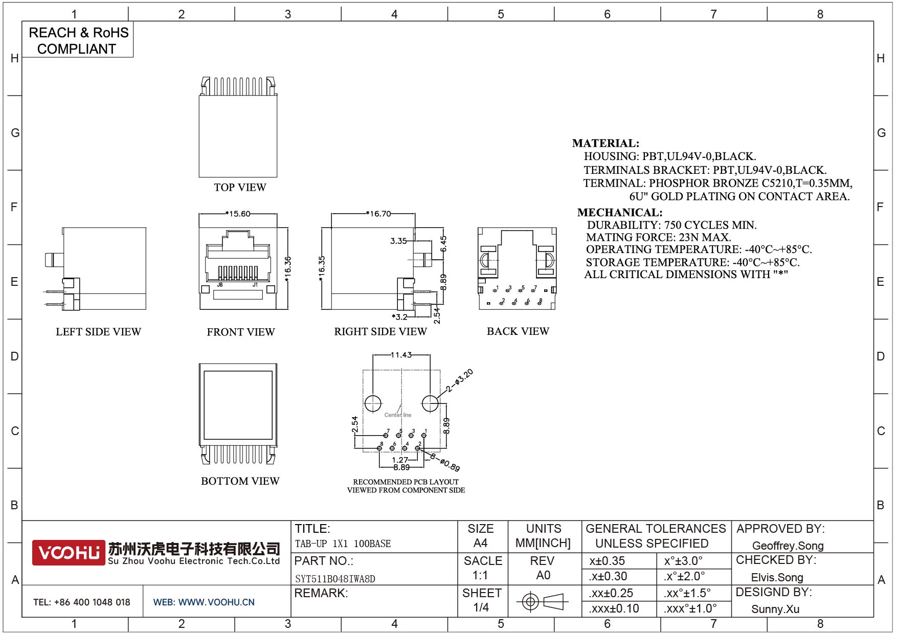 SYT59211418GWA1D7Y1022 90° 侧面插入 1*4 开口朝下 无LED 带屏蔽 DIP RJ45