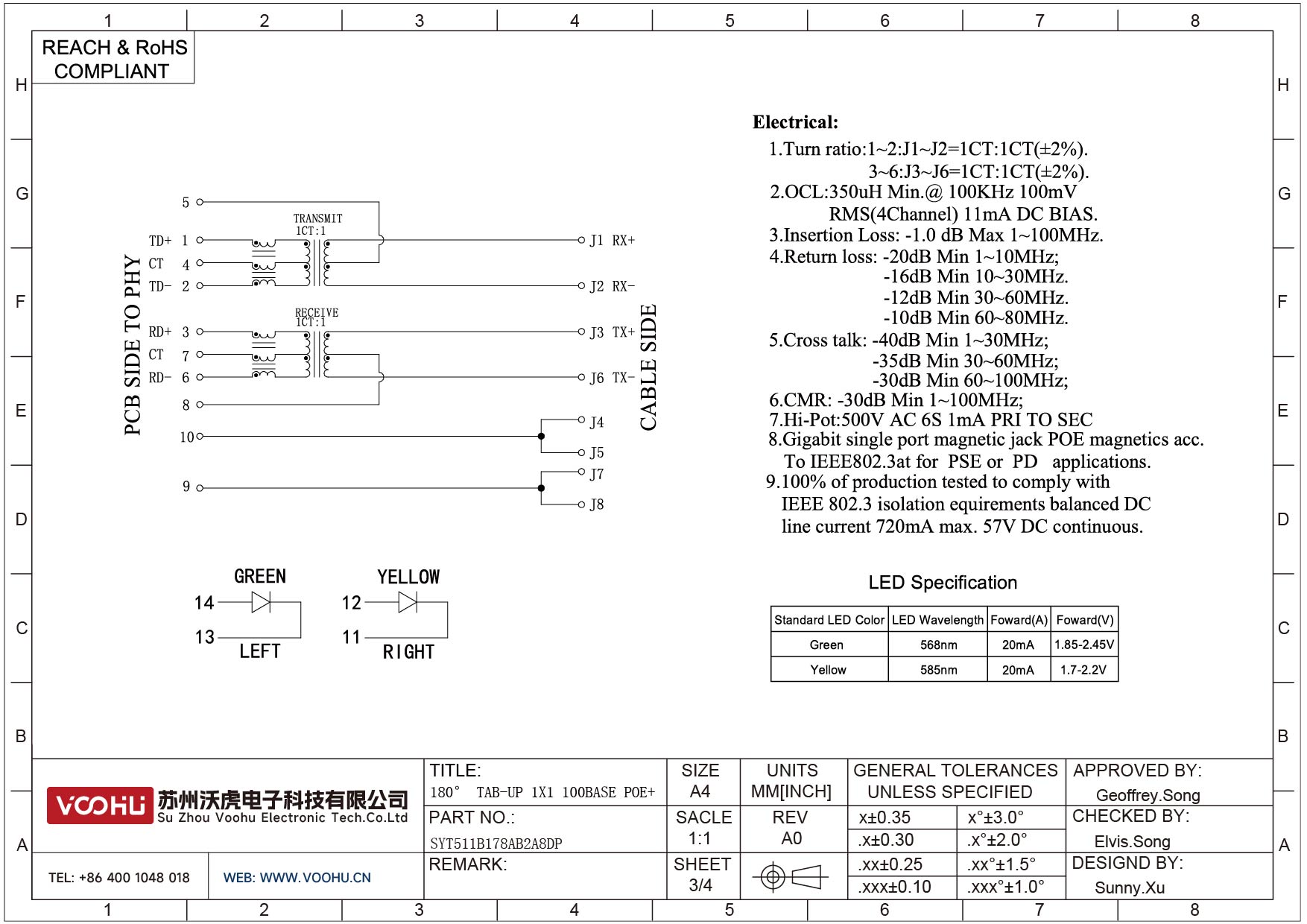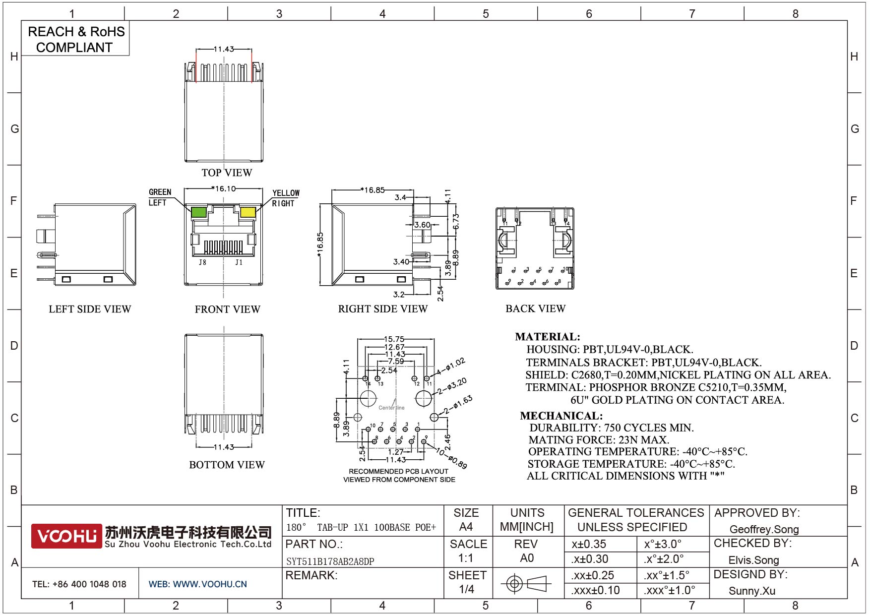 SYT511B178AB2A8DP 180°立式 1*1 开口朝上 10/100M POE 720mA LED G/Y DIP RJ45