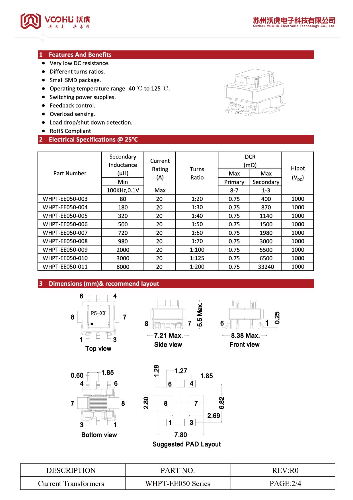 WHPT-EE050-011 L(μH)8000 最大 IR(A)20 匝数比 1:200 隔离(VAC) 1000 尺寸EE5 电流互感器
