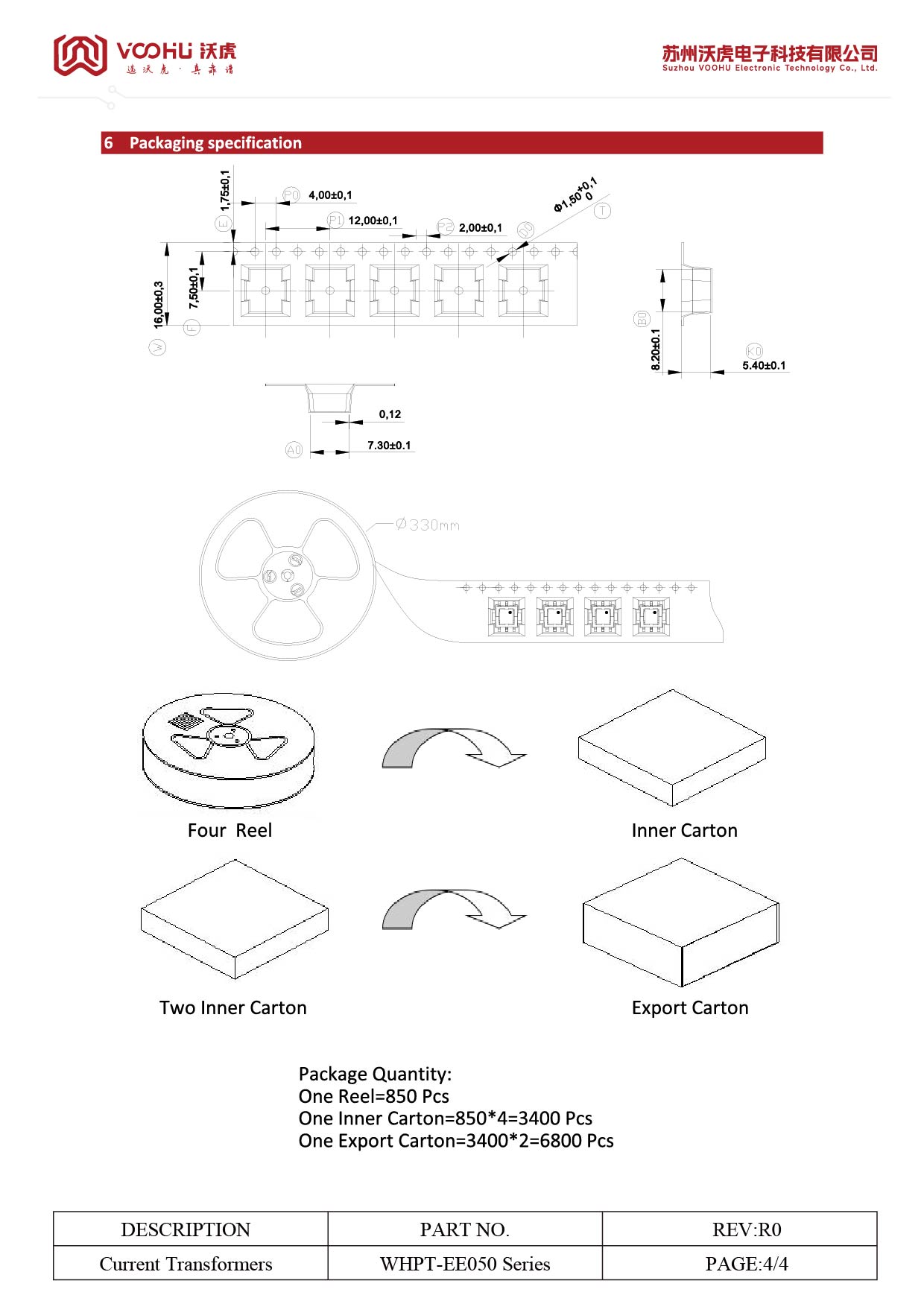 WHPT-EP100-020 L(μH)32000 最大 IR(A)40 匝数比1:200 隔离(VAC)3750 尺寸EP10 电流互感器