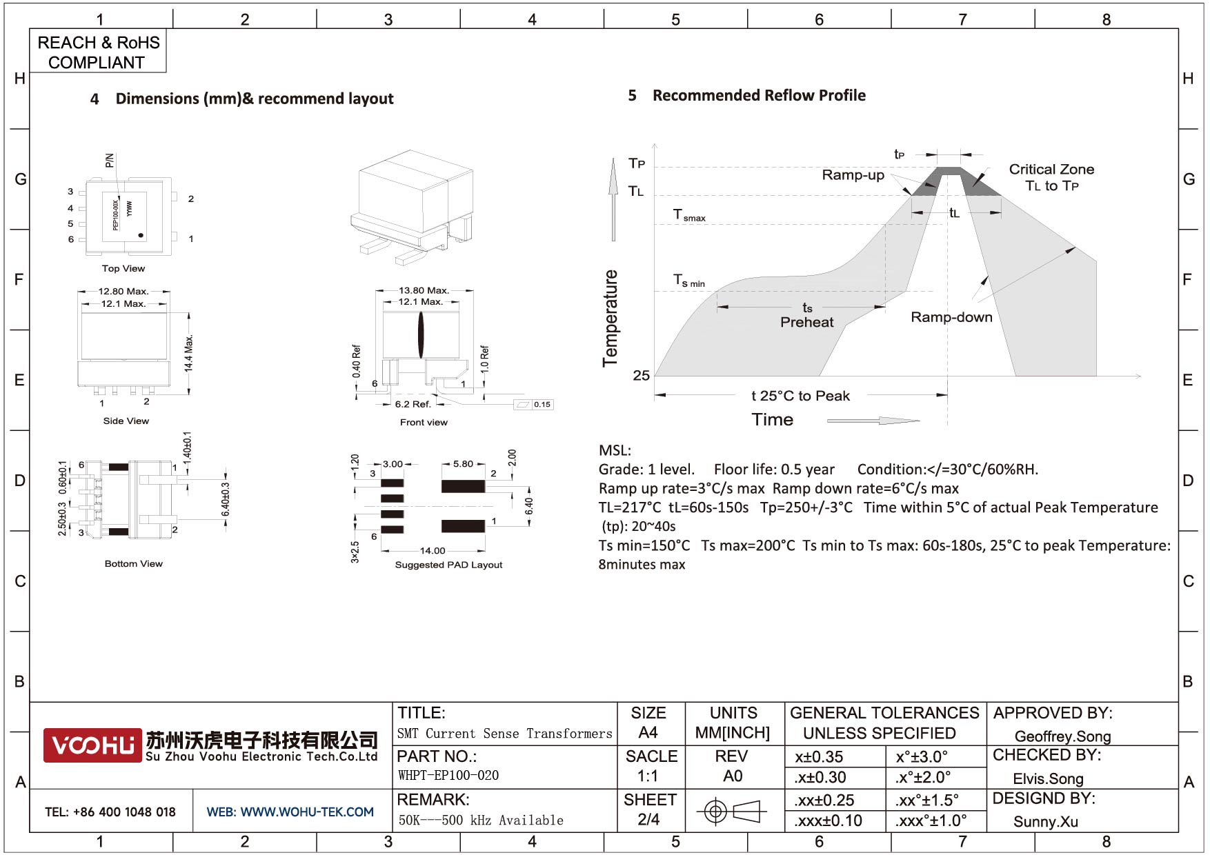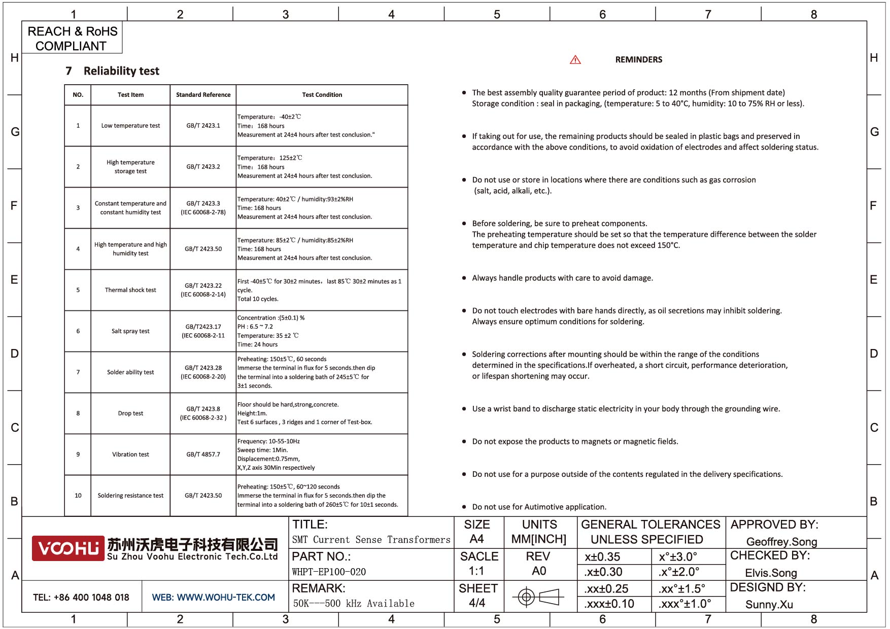 WHPT-EP100-020 L(μH)32000 最大 IR(A)40 匝数比1:200 隔离(VAC)3750 尺寸EP10 电流互感器