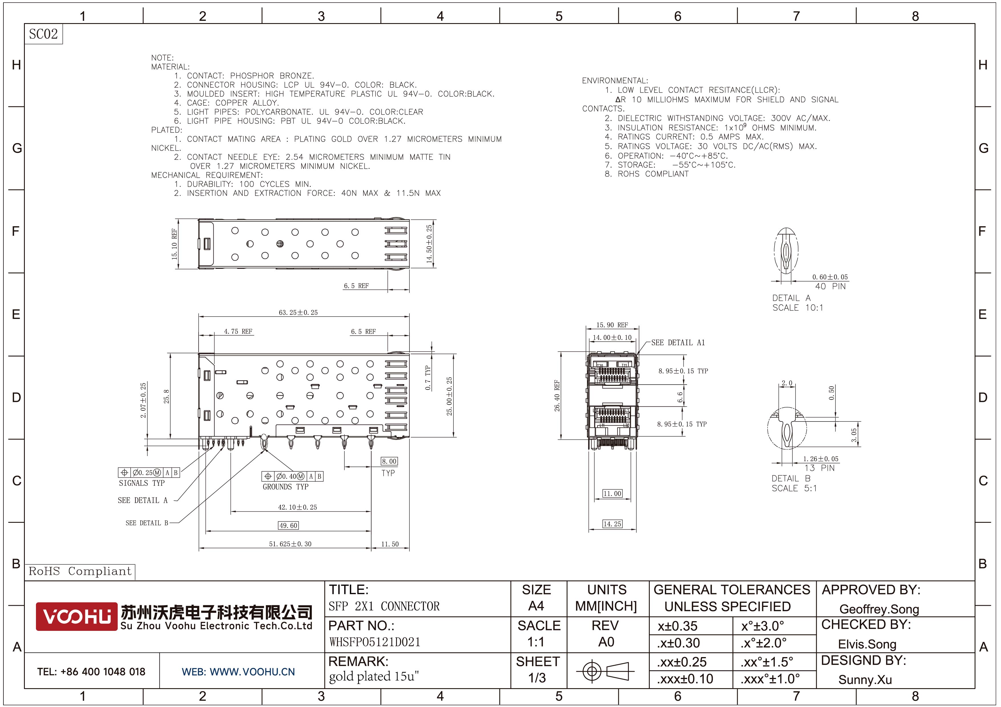 WHSFP05121D021 SFP 2×1 5G Cage+Connector SFP镀金厚度15U 光纤笼子