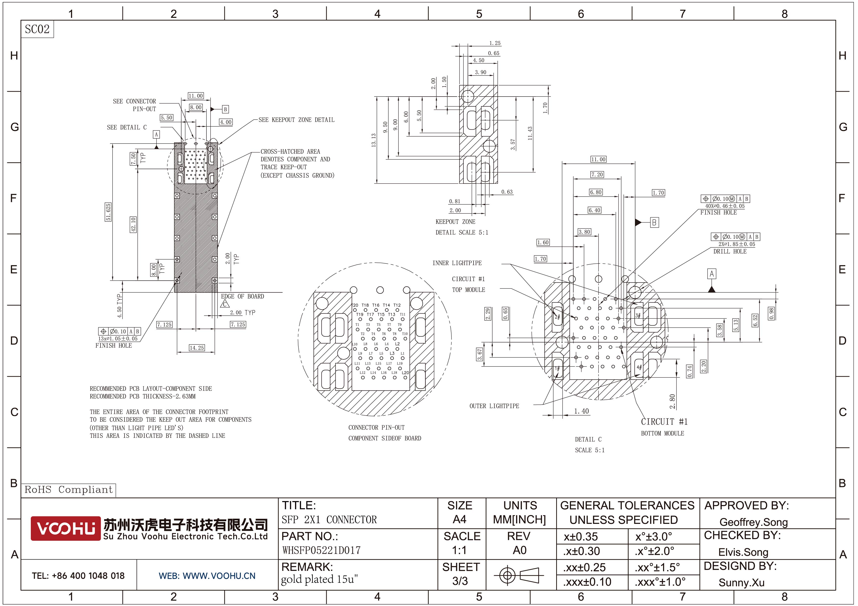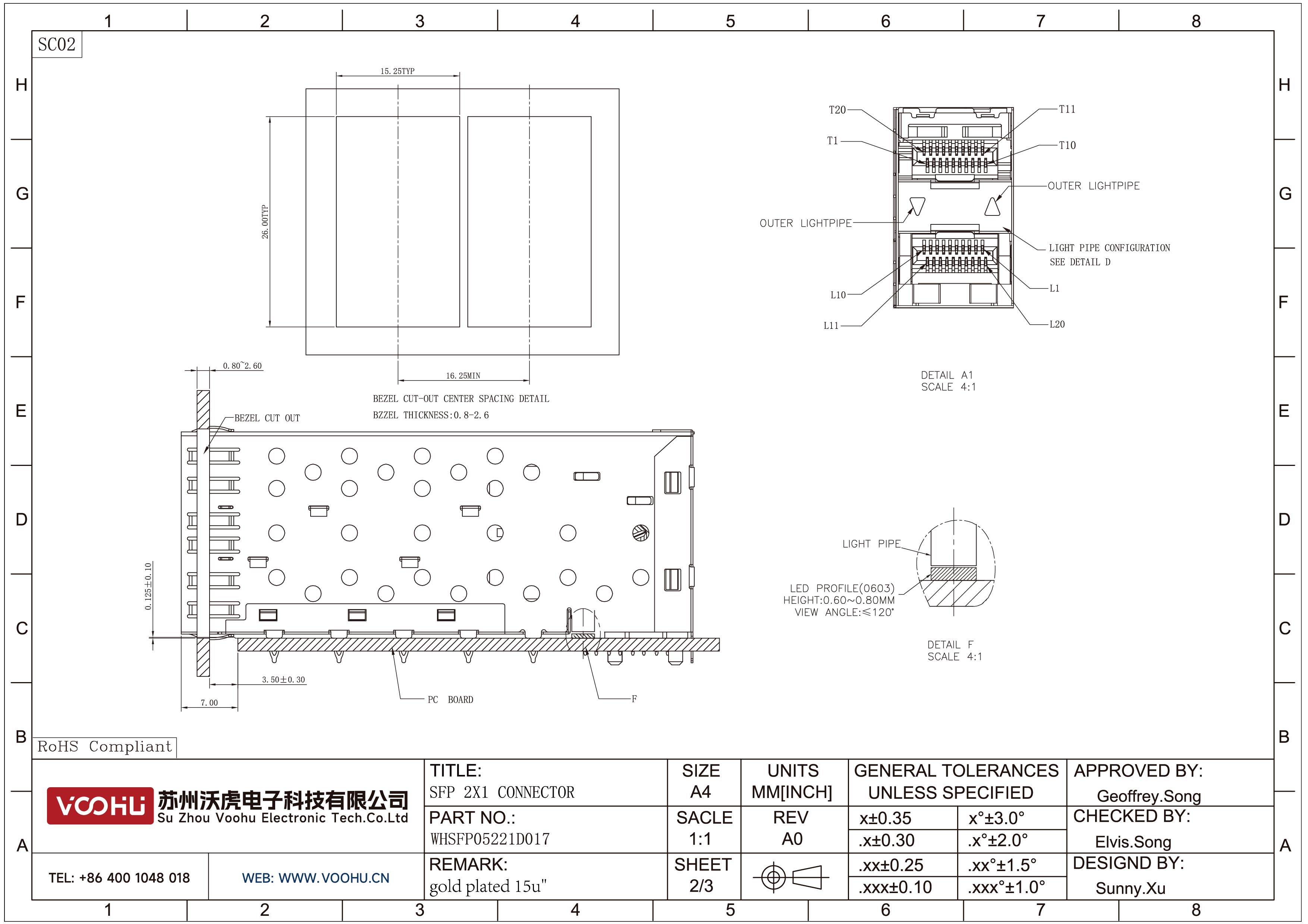 WHSFP05221D017 SFP 2×1 5G Cage+Connector SFP镀金厚度15U 光纤笼子