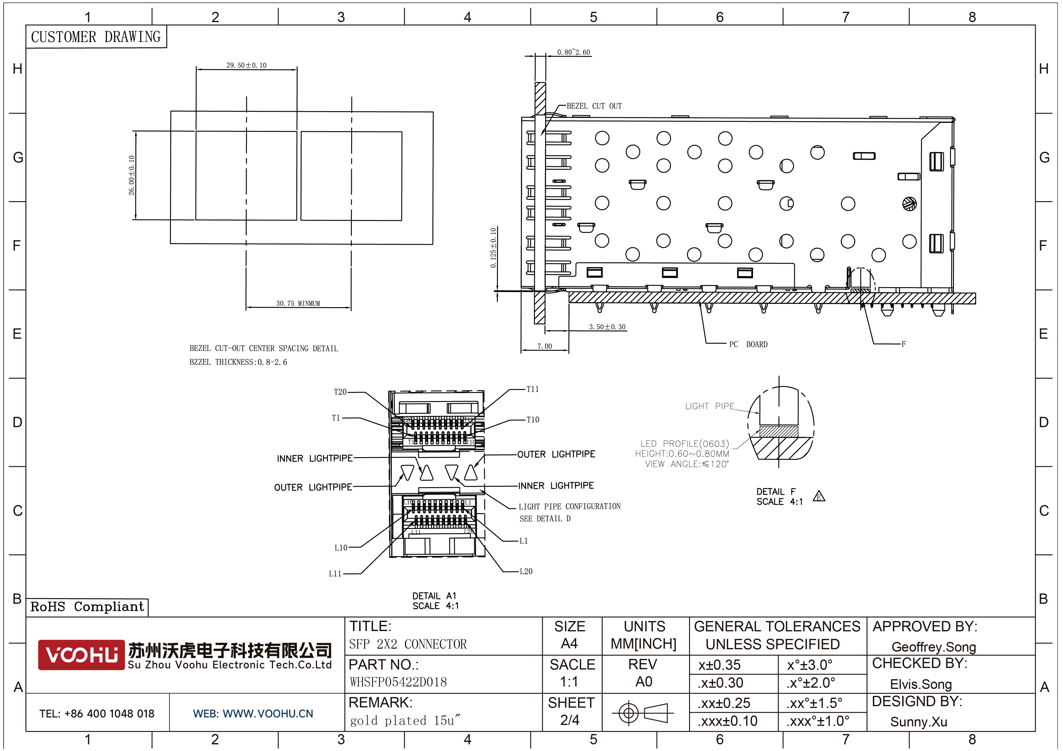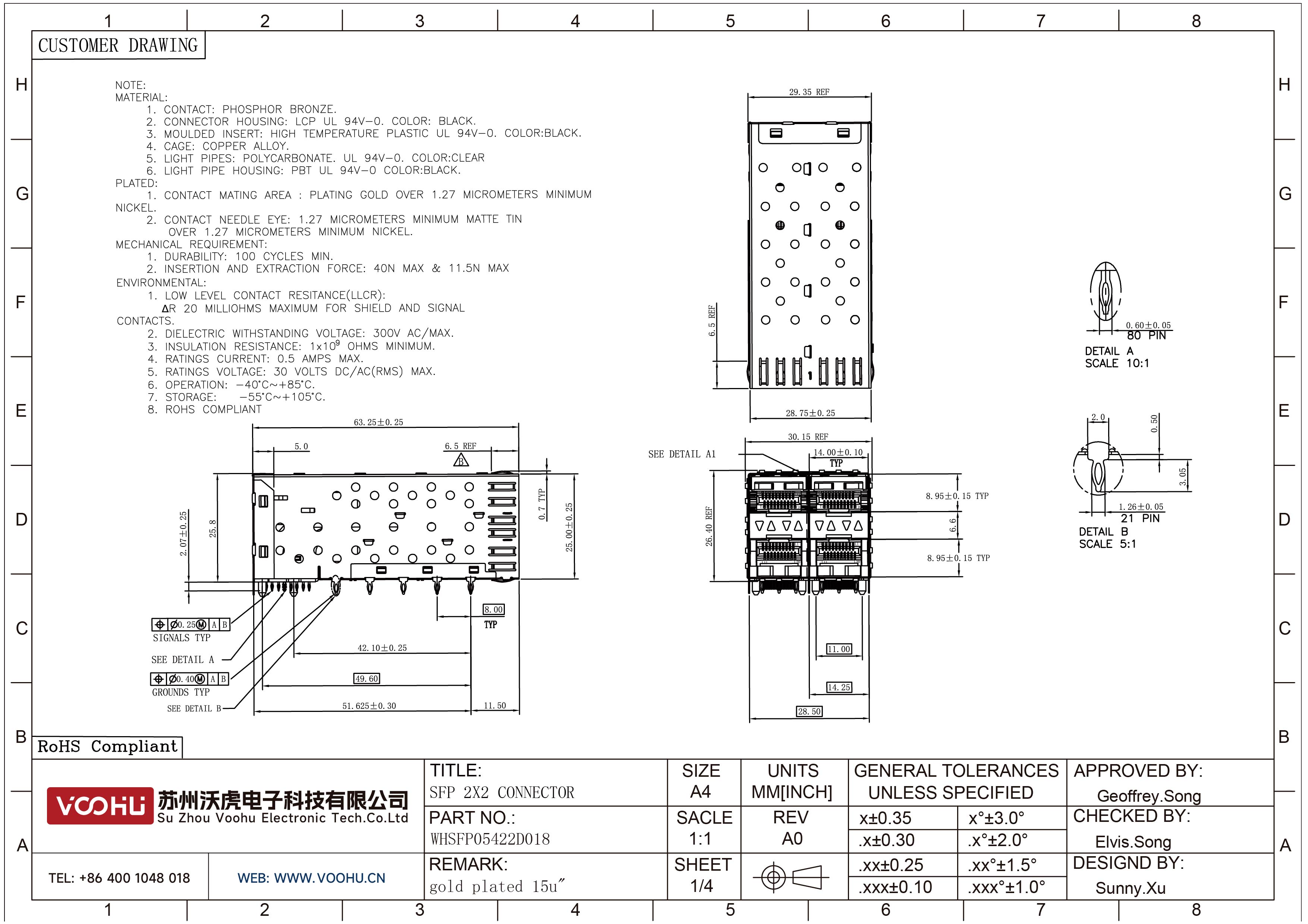 WHSFP05422D018 SFP 2×2 5G Cage+Connector SFP镀金厚度15U 光纤笼子