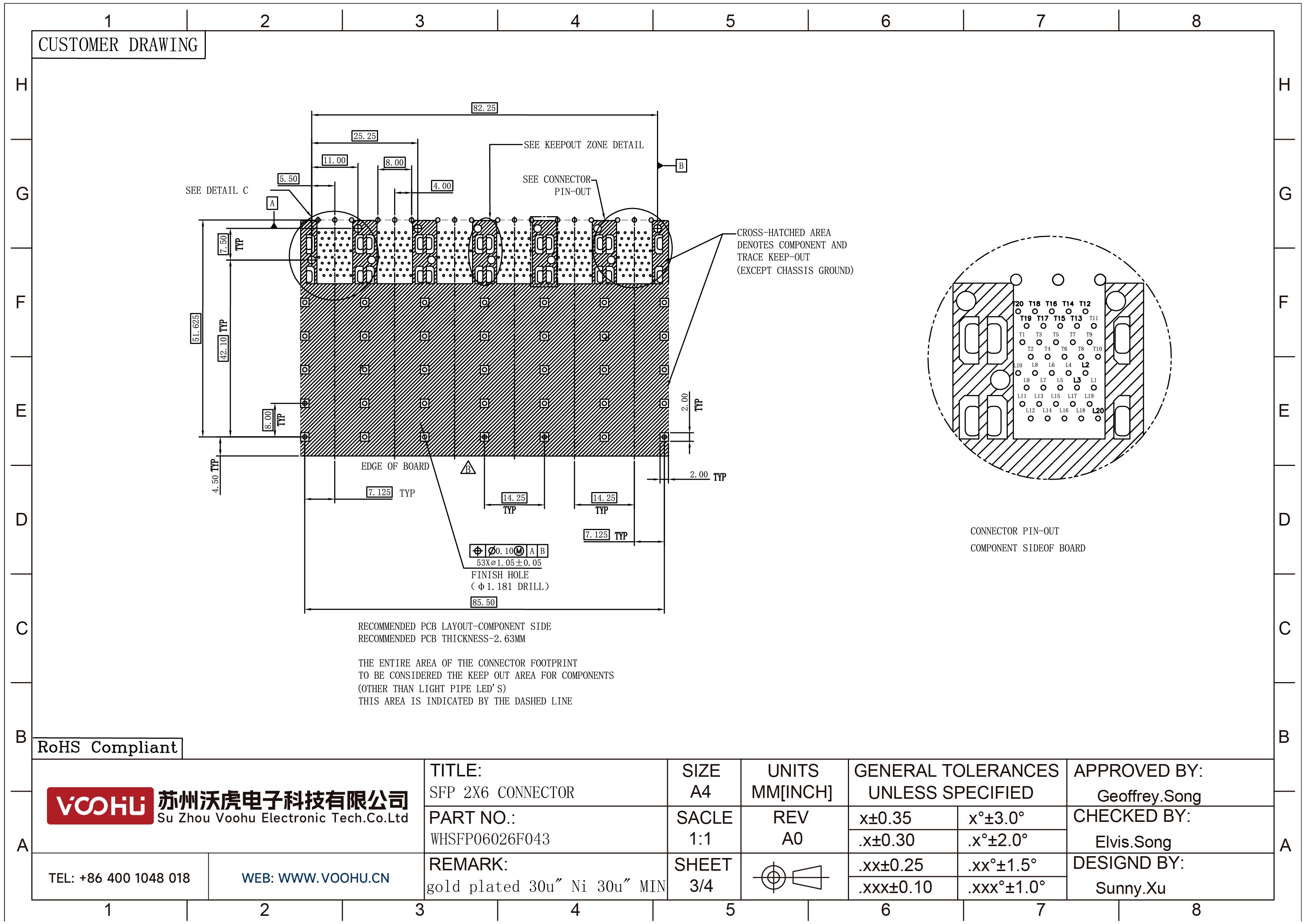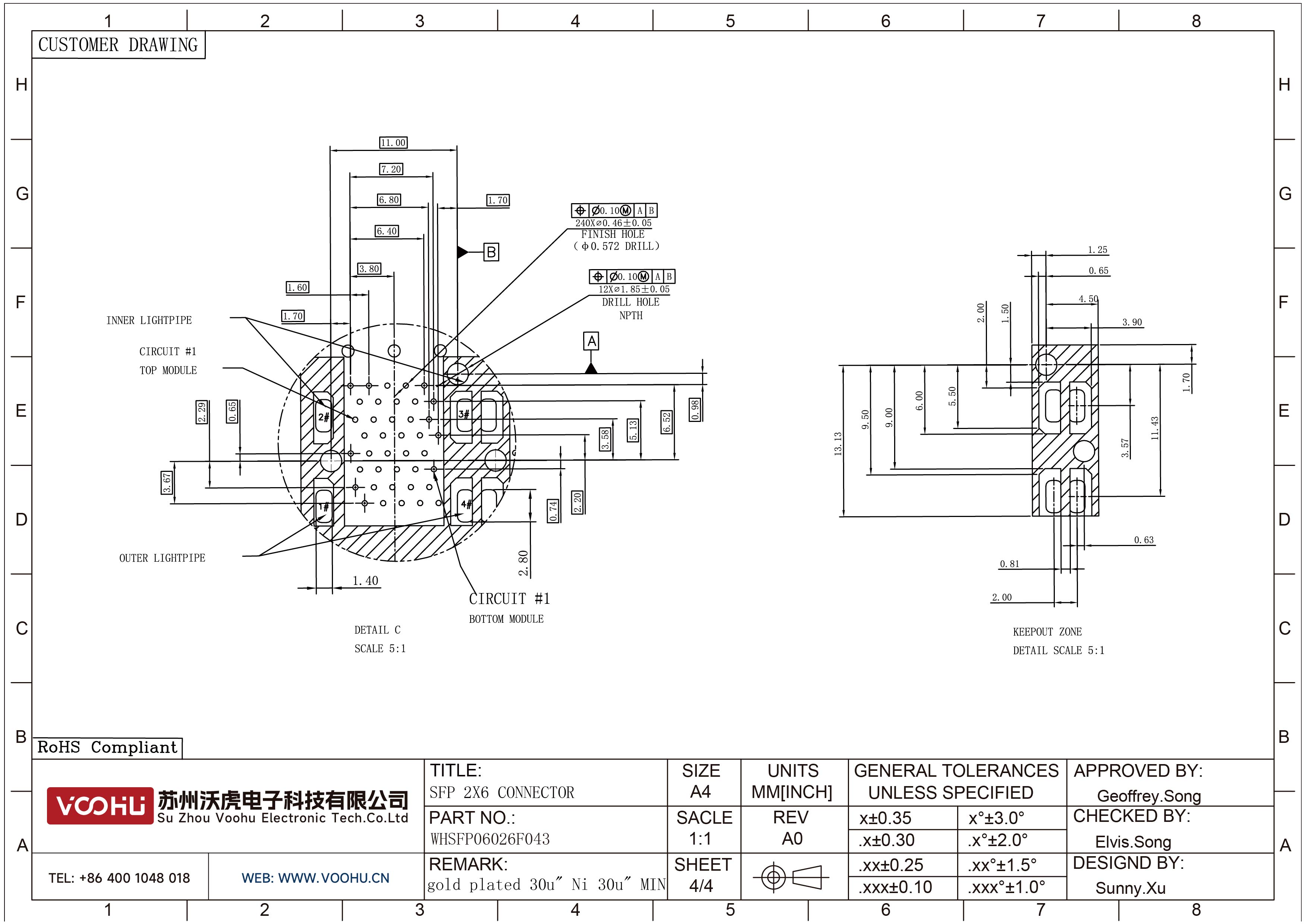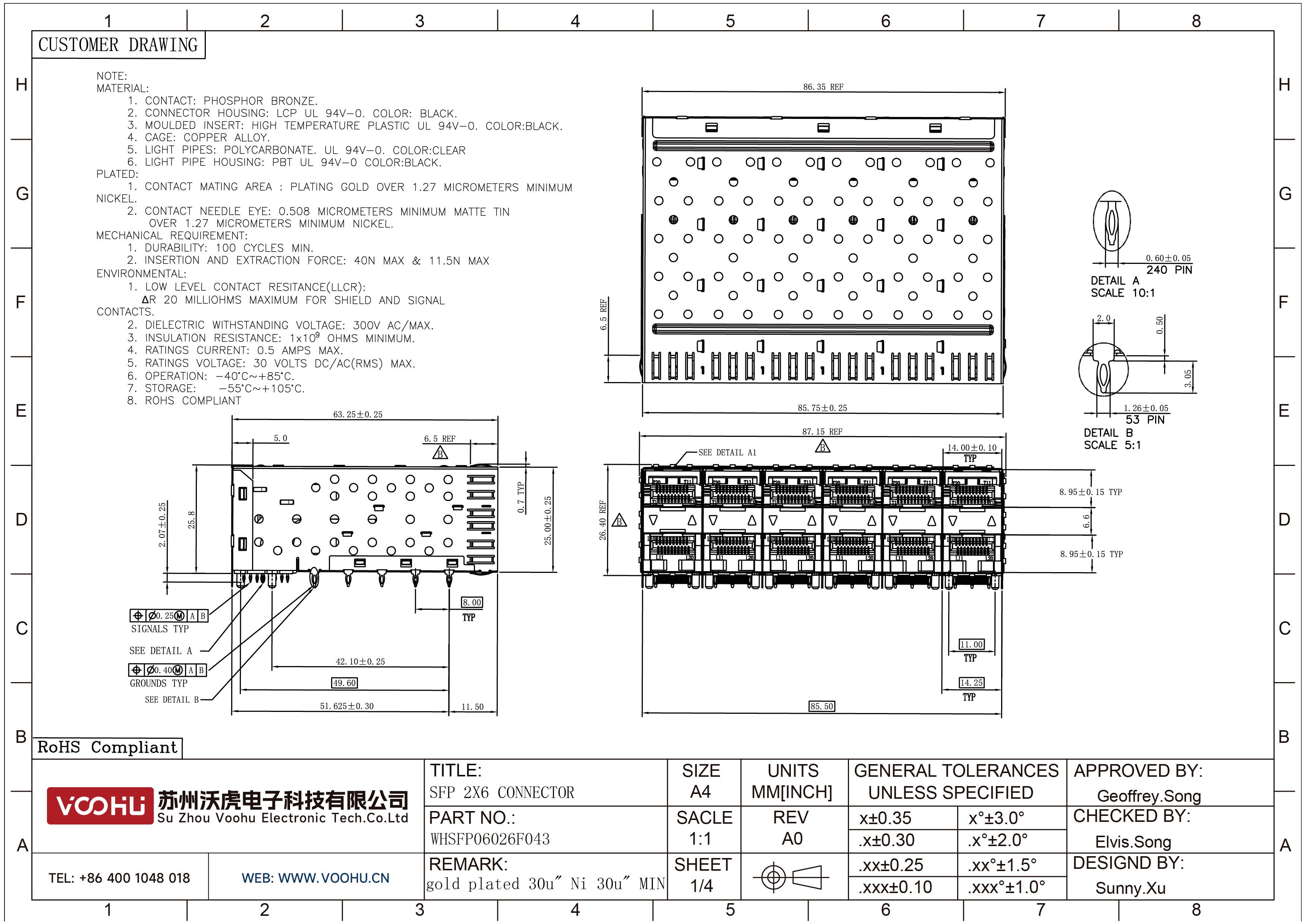WHSFP06026F043 SFP 2×6 5G Cage+Connector SFP镀金厚度30U 镀镍 30U 光纤笼子