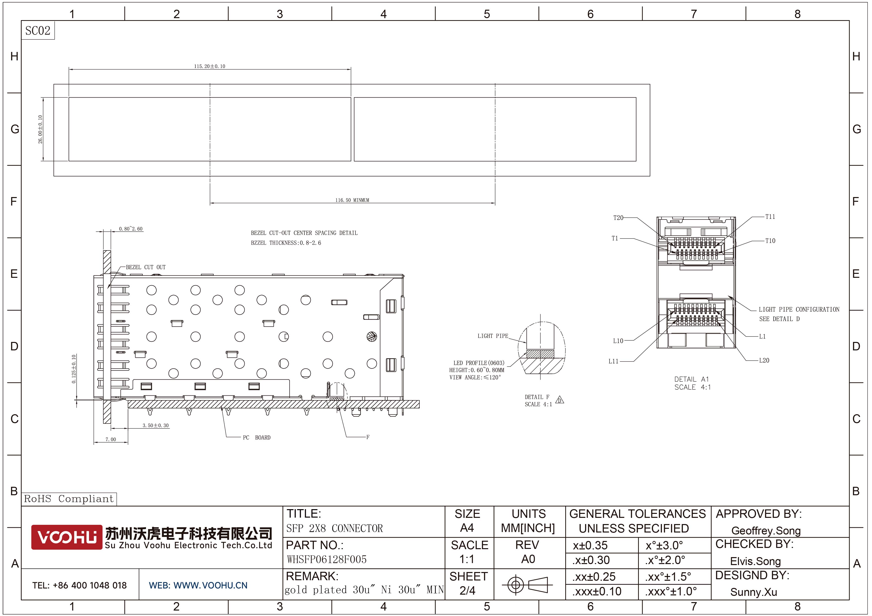 WHSFP06128F005 SFP 2×8 5G Cage+Connector SFP镀金厚度30U 镀镍 30U 光纤笼子
