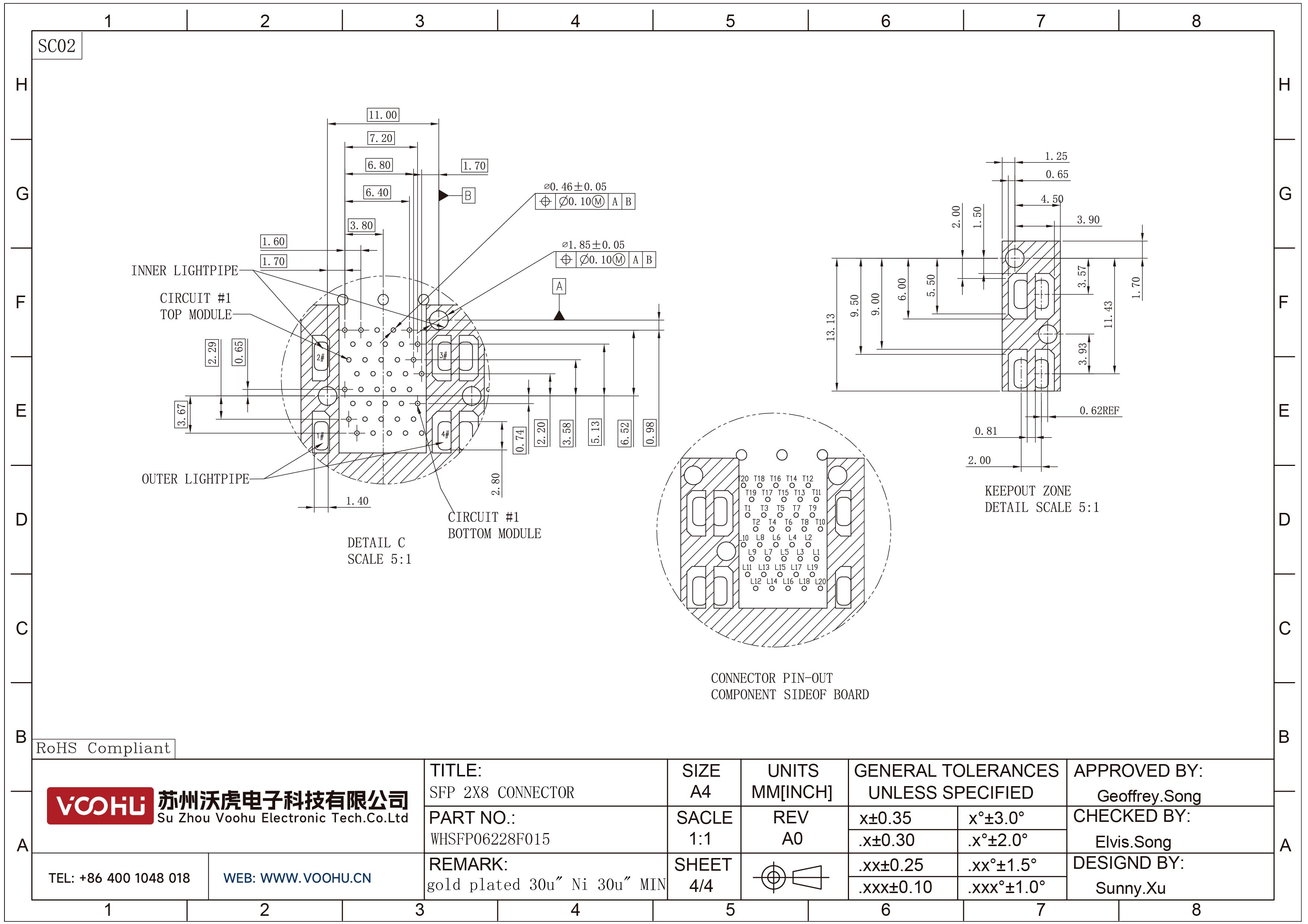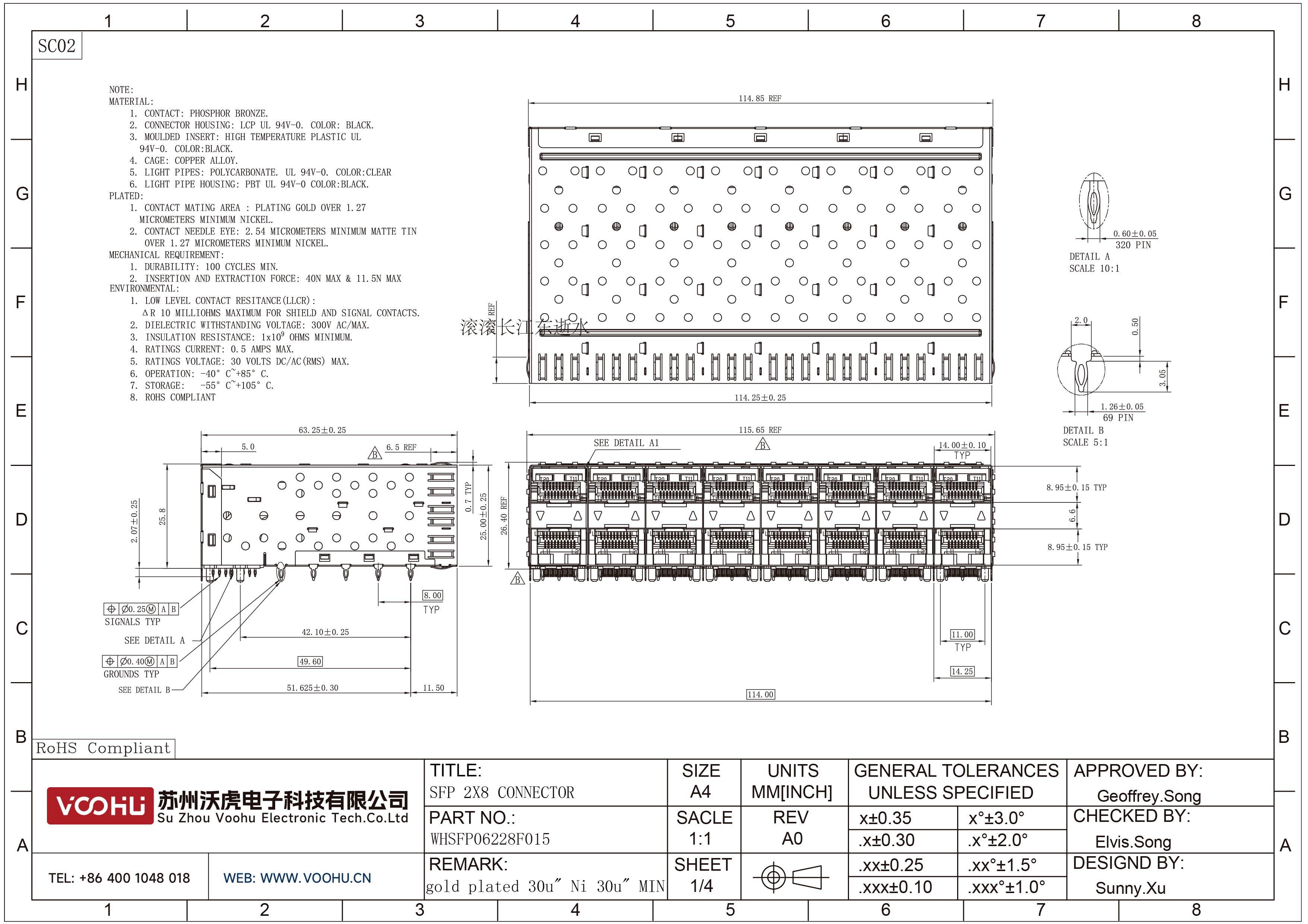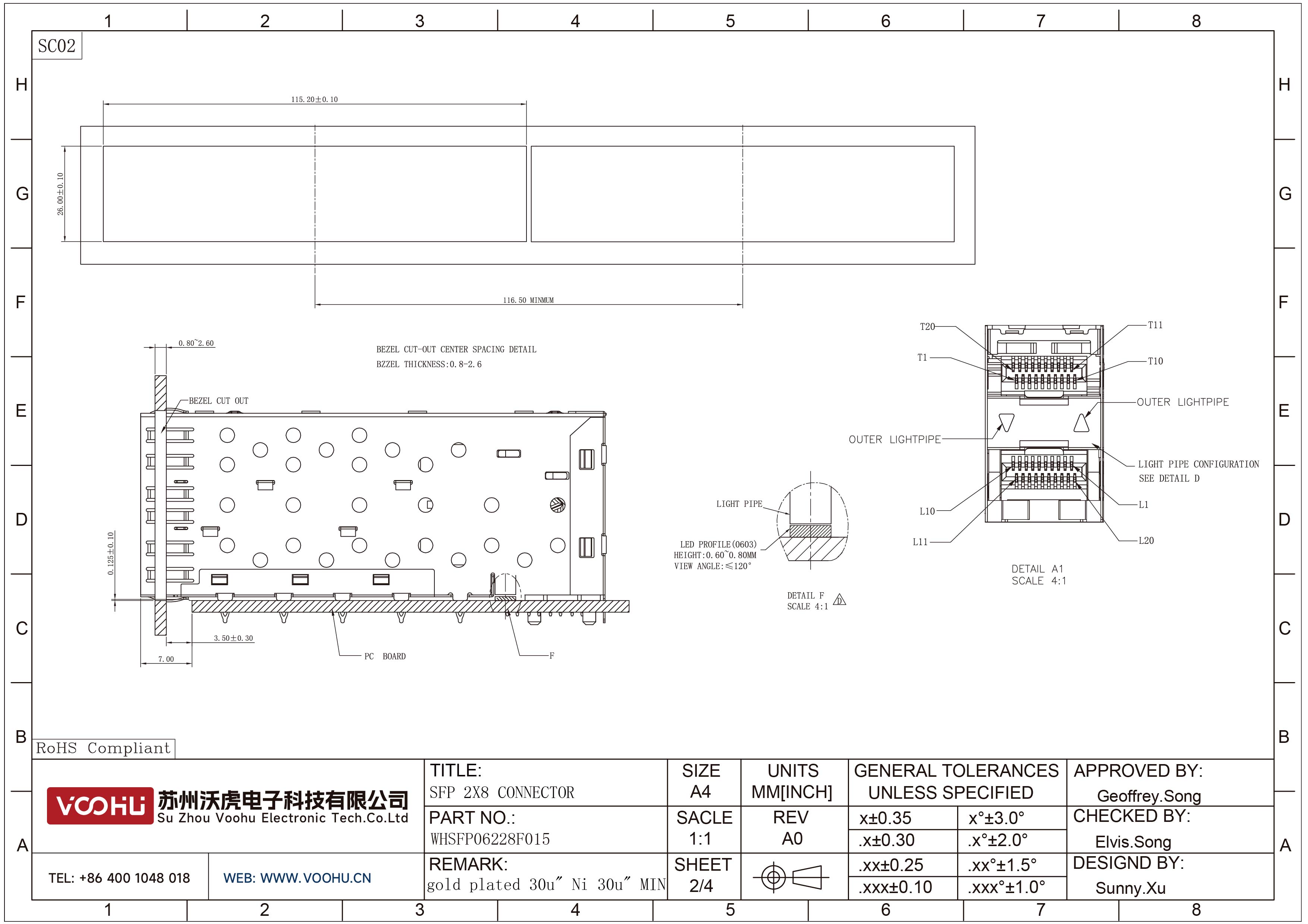 WHSFP06228F015 SFP 2×8 5G Cage+Connector SFP镀金厚度30U 镀镍 30U 光纤笼子