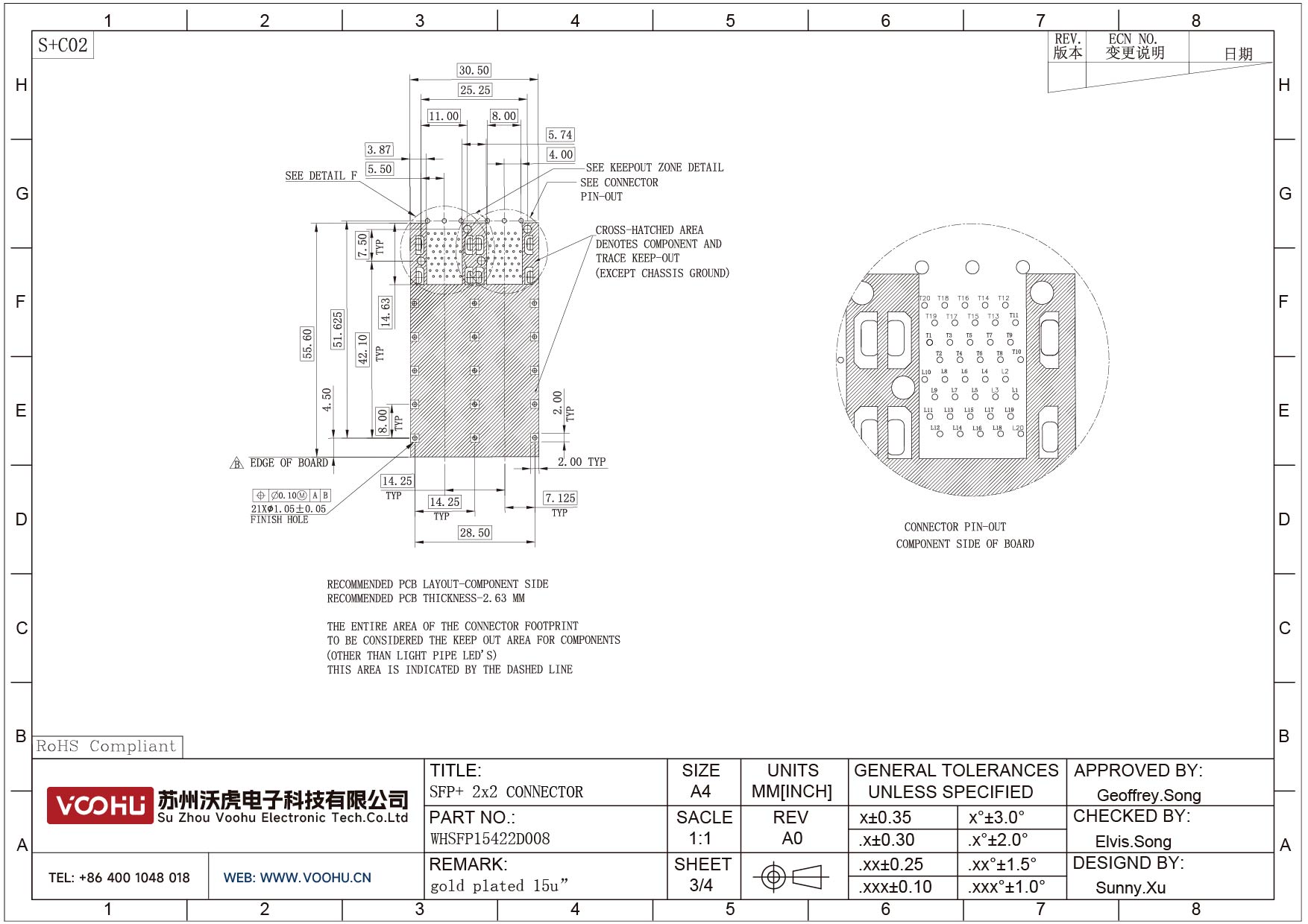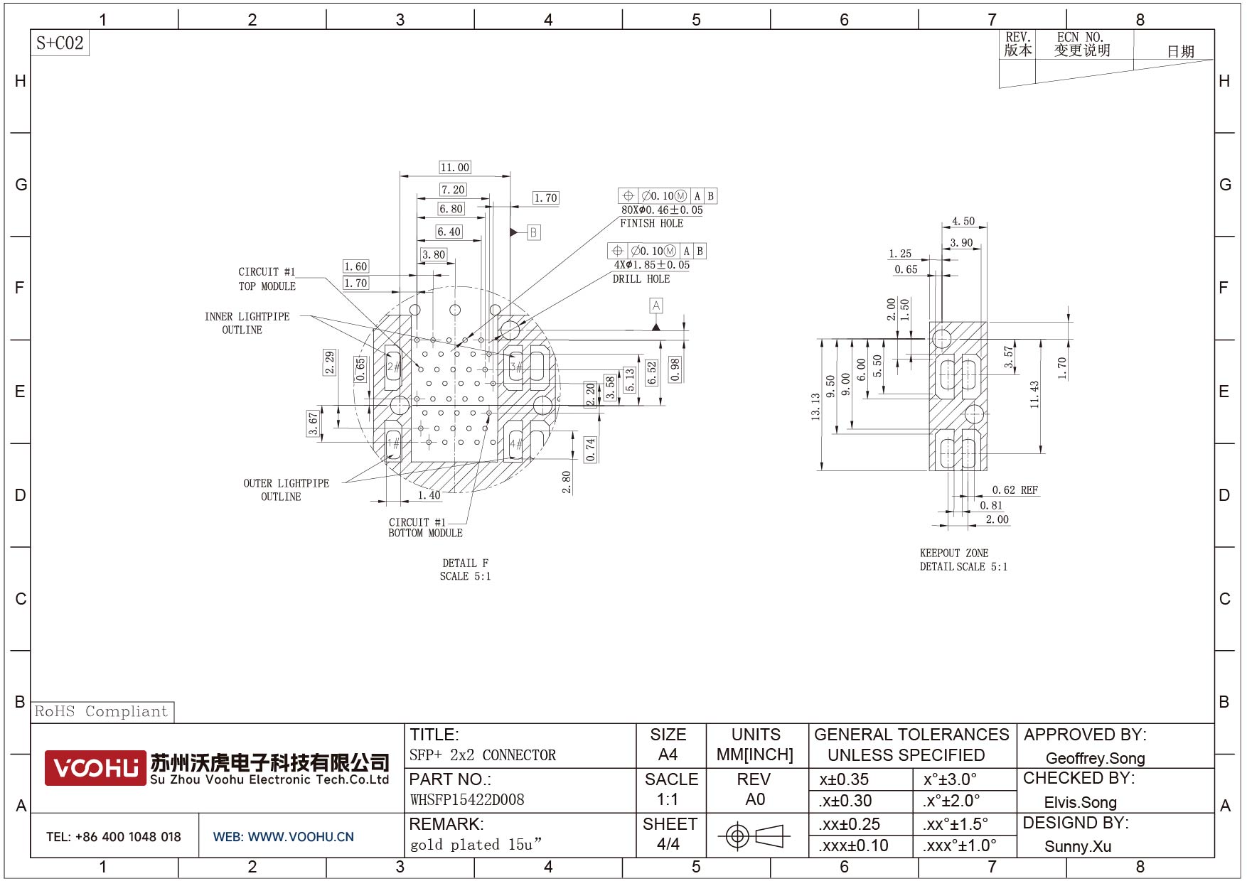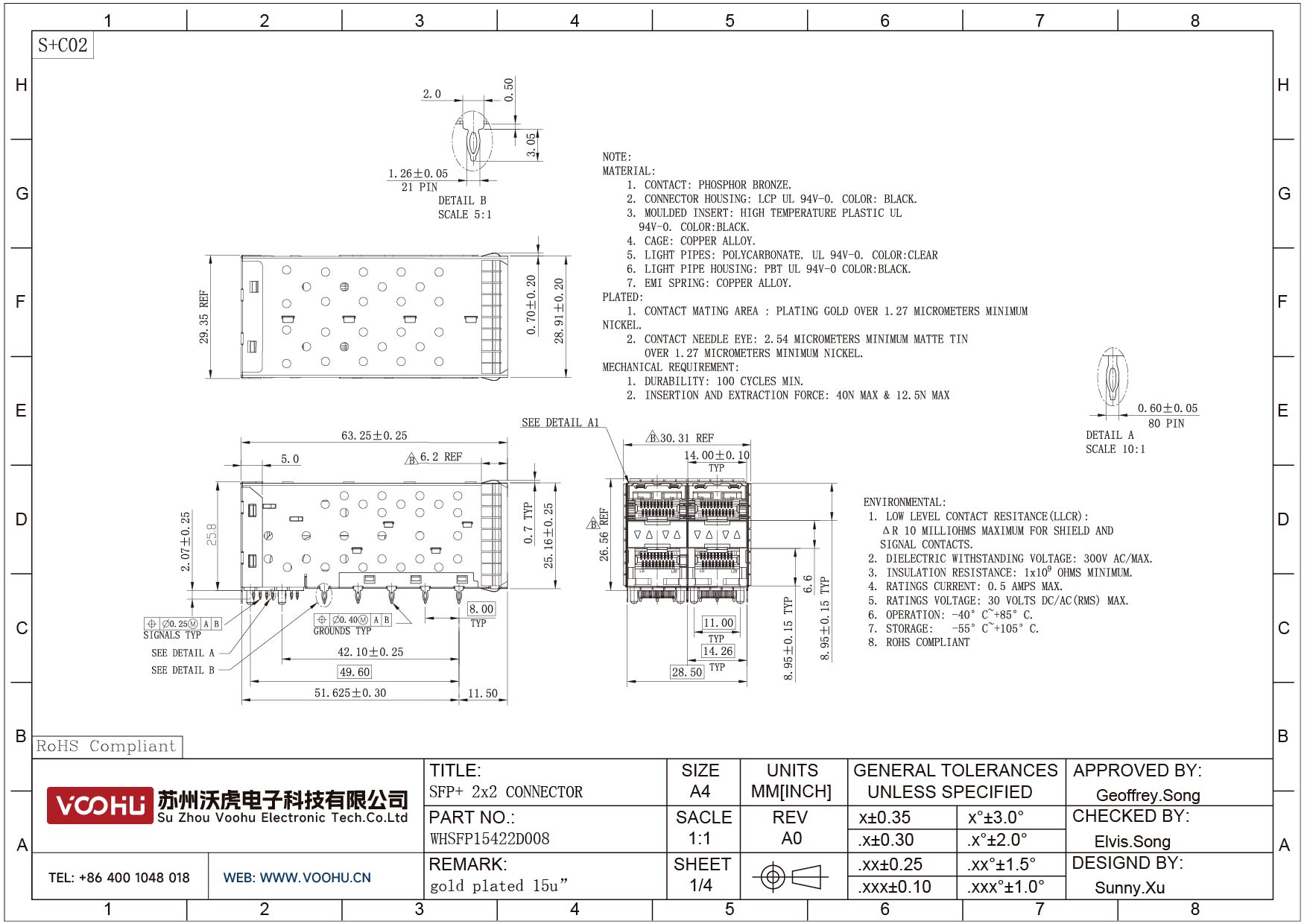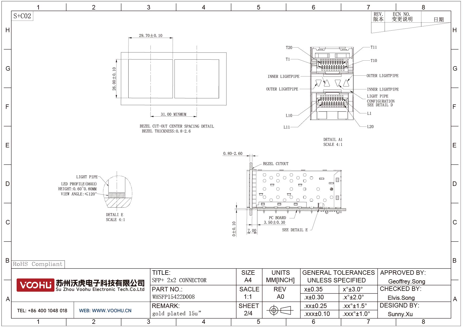 WHSFP15422D008 SFP+ 2×2 10G Press-Fit Cage+Connector SFP镀金厚度15U 光纤笼子