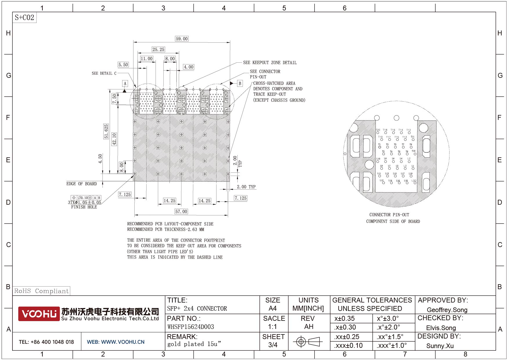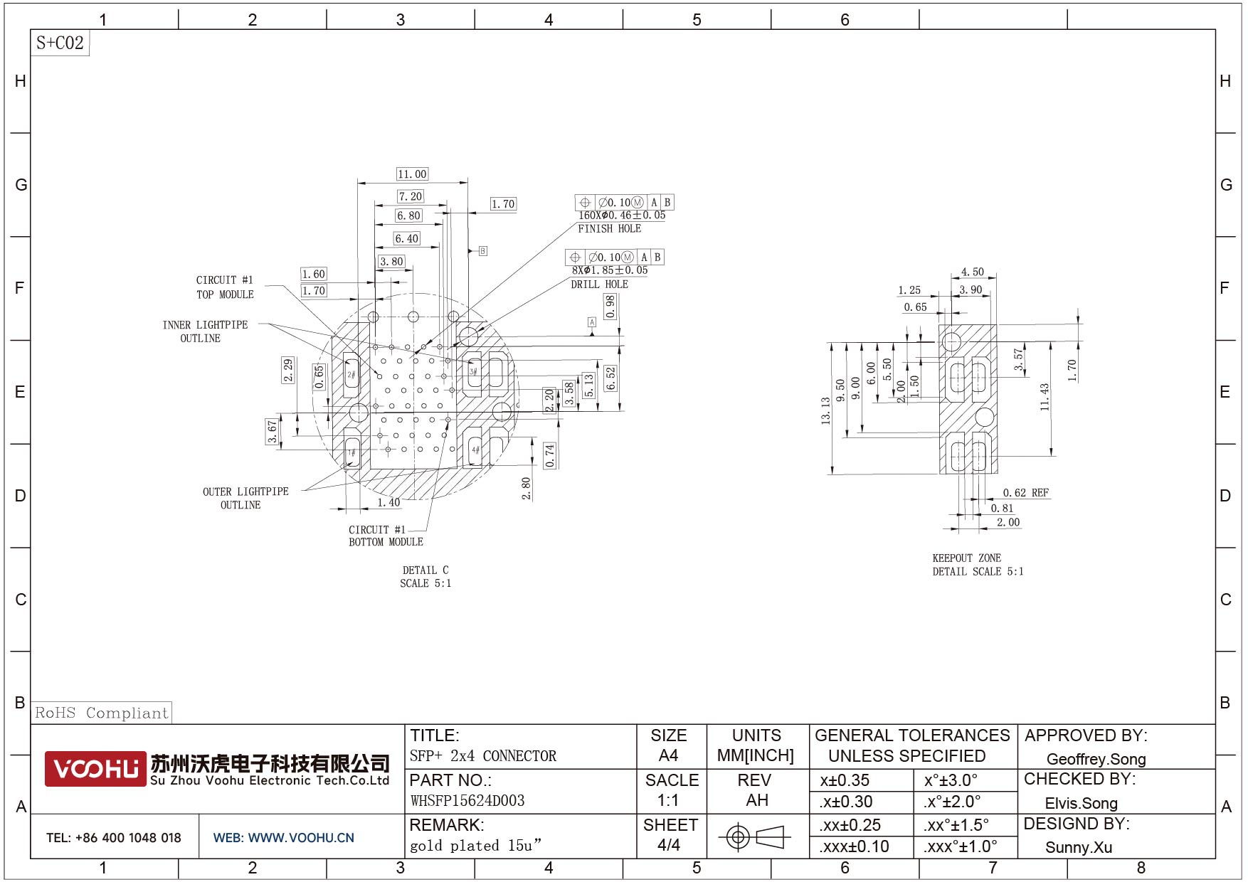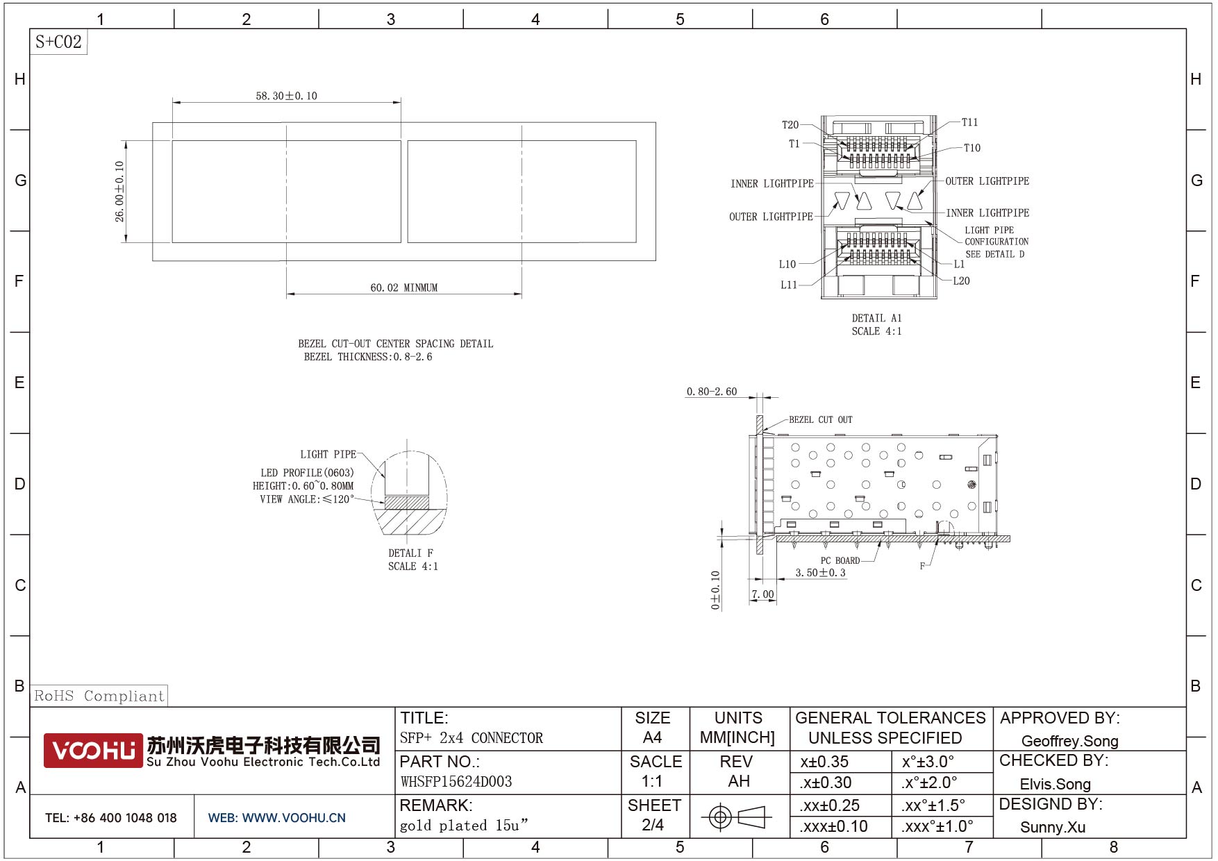 WHSFP15624D003 SFP+ 2×4 10G Press-Fit Cage+Connector SFP镀金厚度15U 光纤笼子
