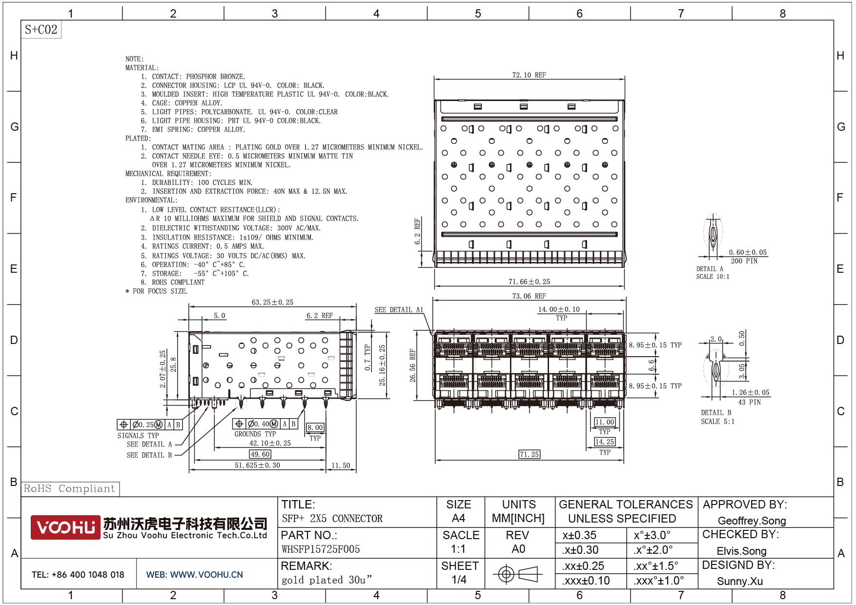 WHSFP15725F005 SFP+ 2×5 10G Press-Fit Cage+Connector SFP镀金厚度30U 光纤笼子