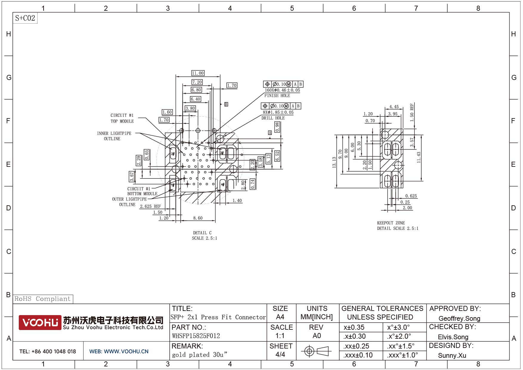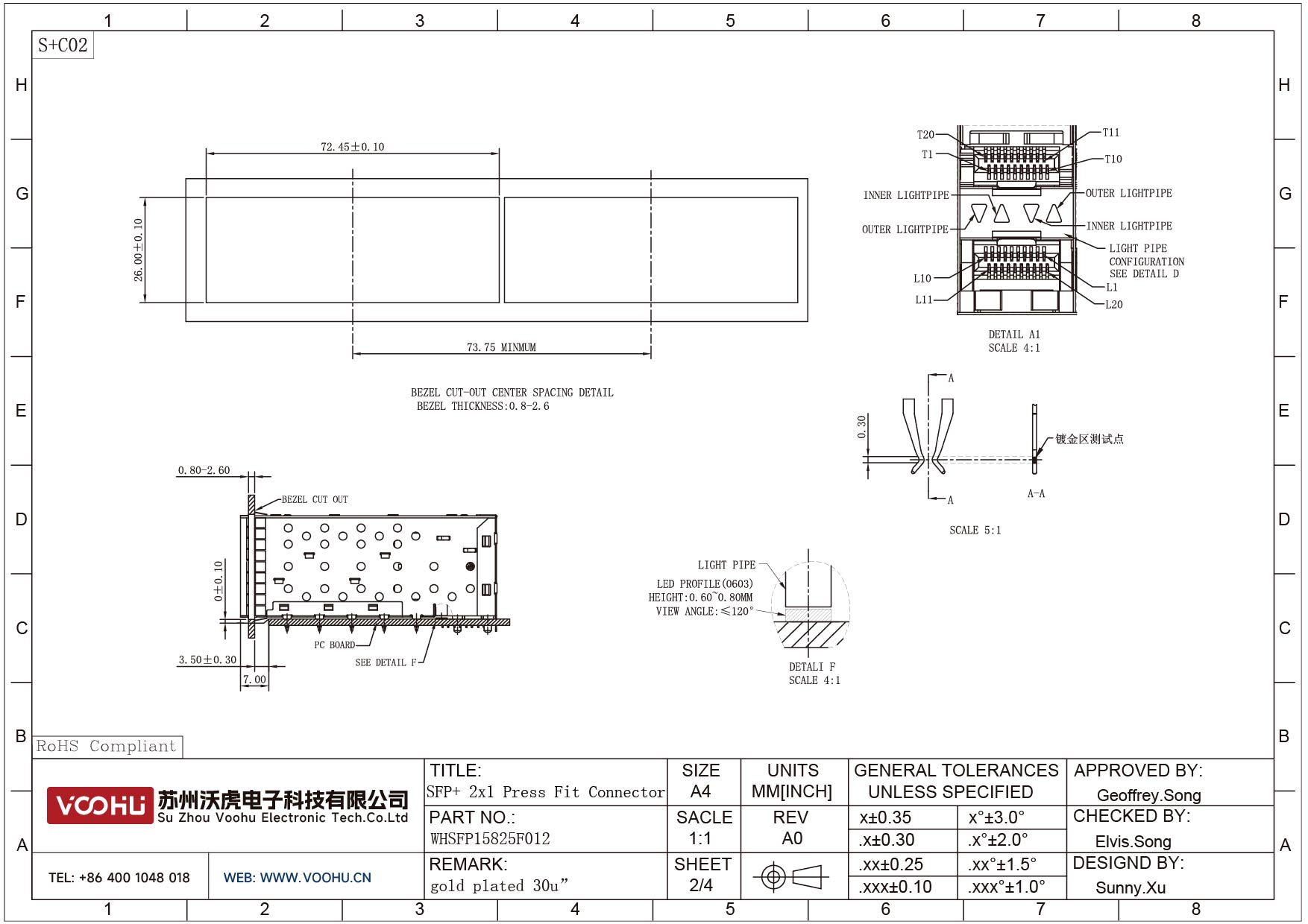 WHSFP15825F012 SFP+ 2×5 10G Press-Fit Cage+Connector SFP镀金厚度30U 光纤笼子
