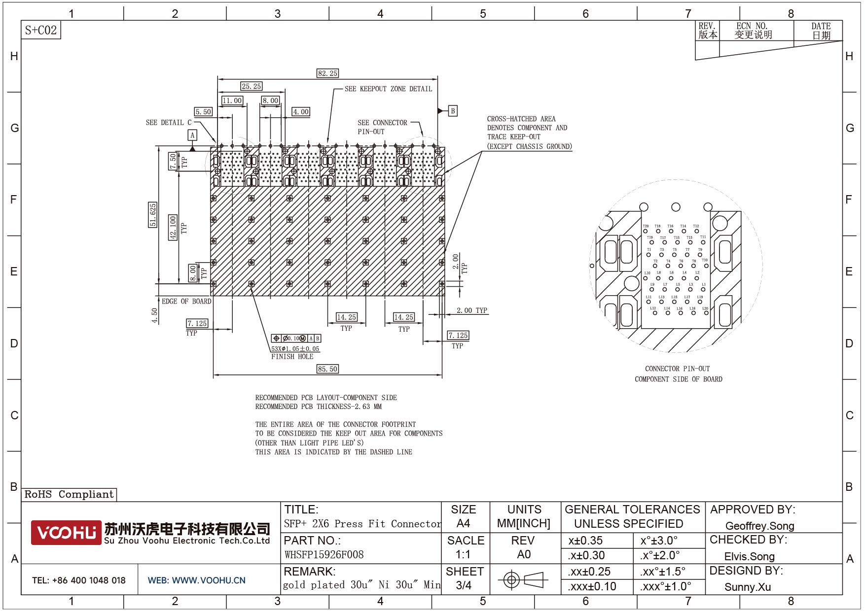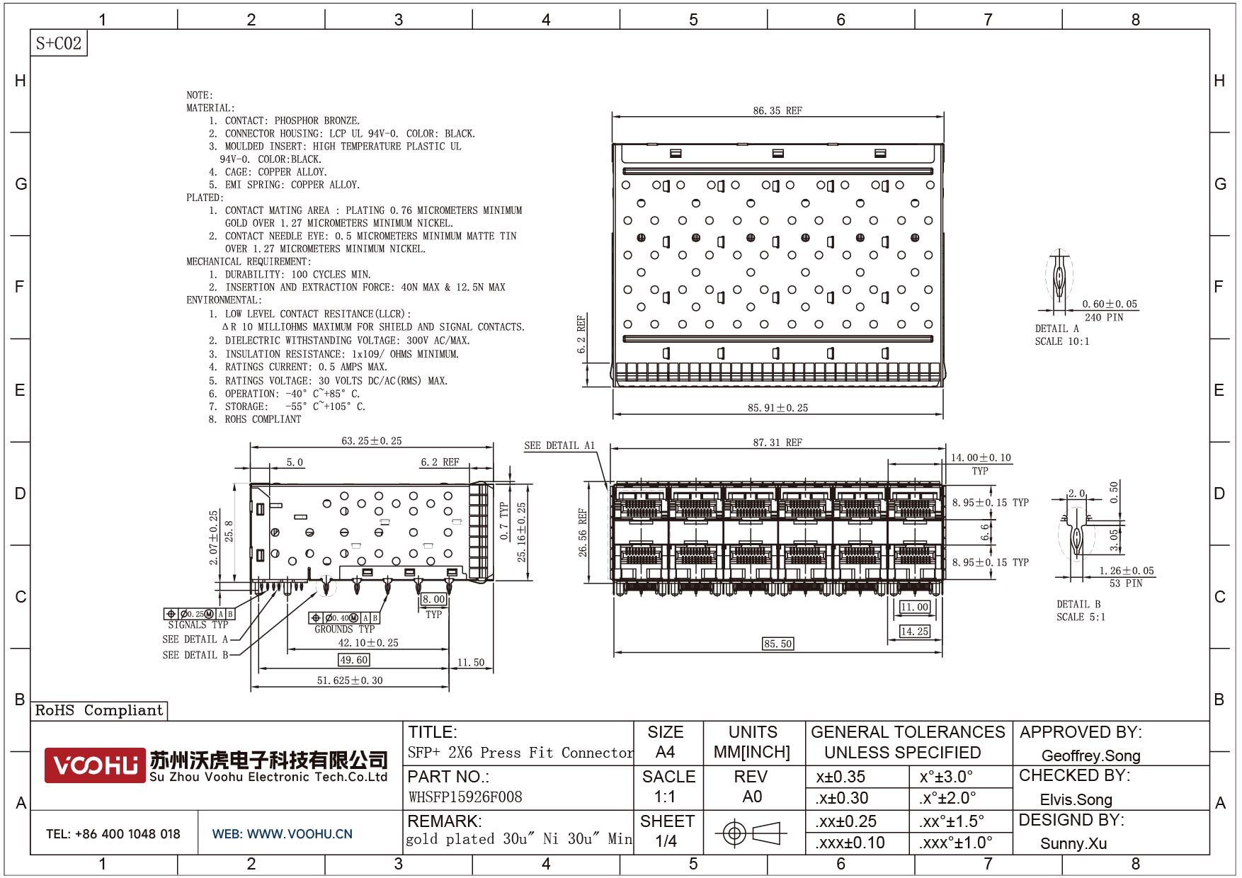 WHSFP15926F008 SFP+ 2×6 10G Press-Fit Cage+Connector SFP镀金厚度30U 镀镍 30U 光纤笼子