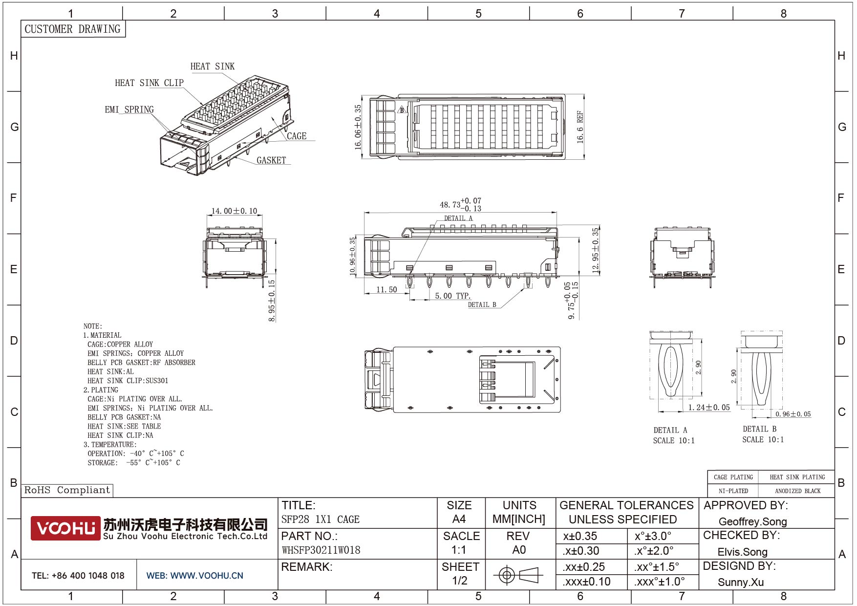 WHSFP30211W018 SFP28 1 × 1 25G 散热片 Cage 光纤笼子