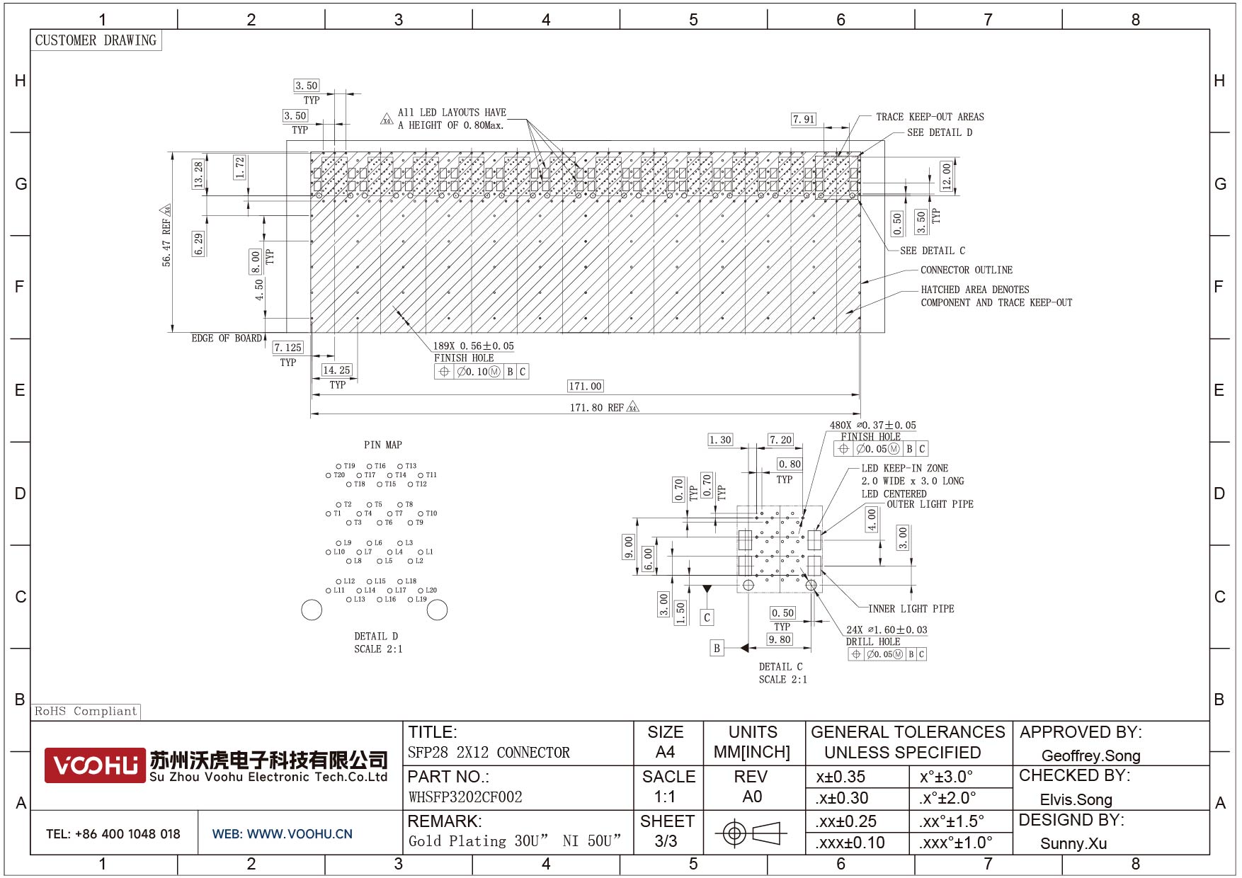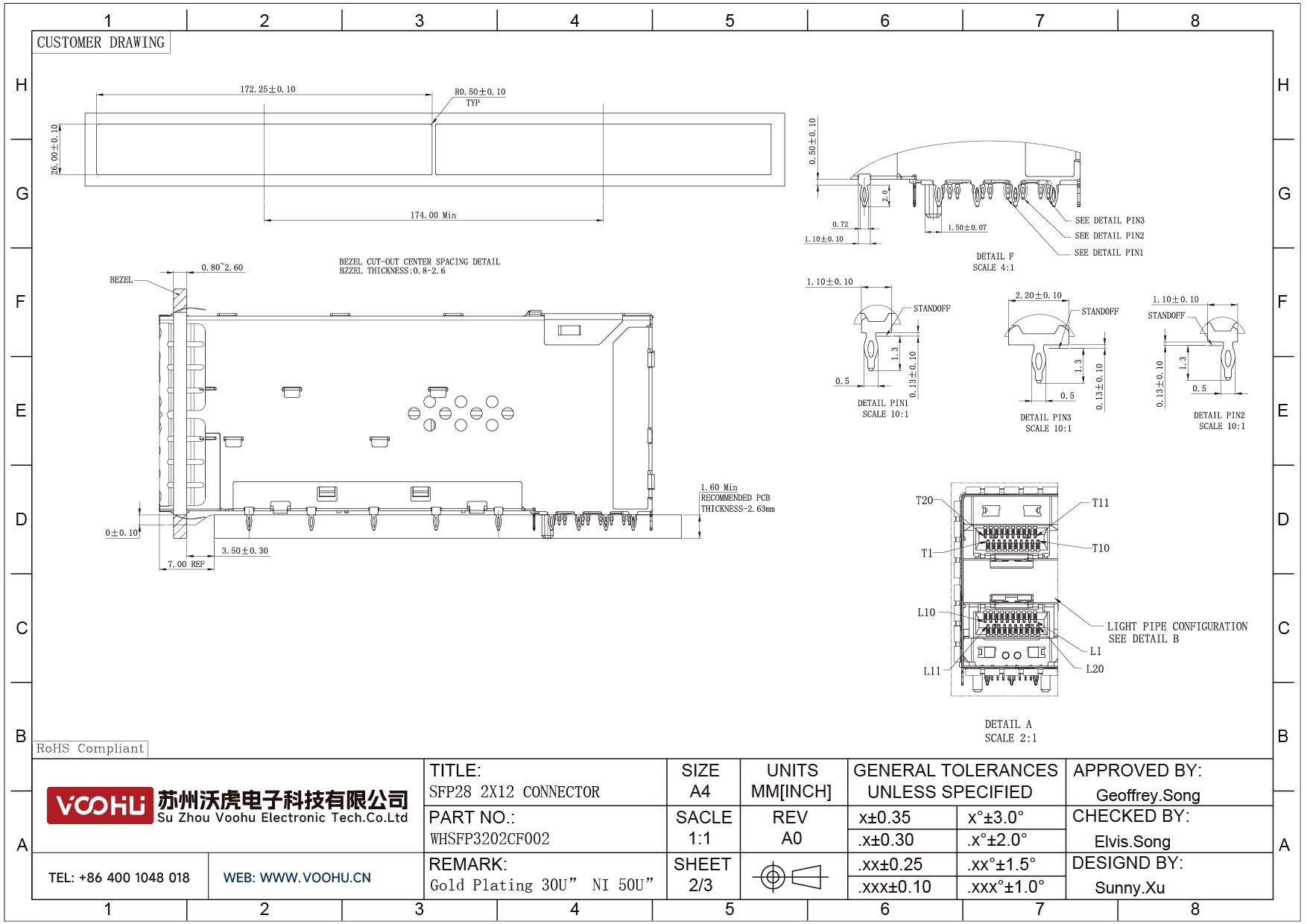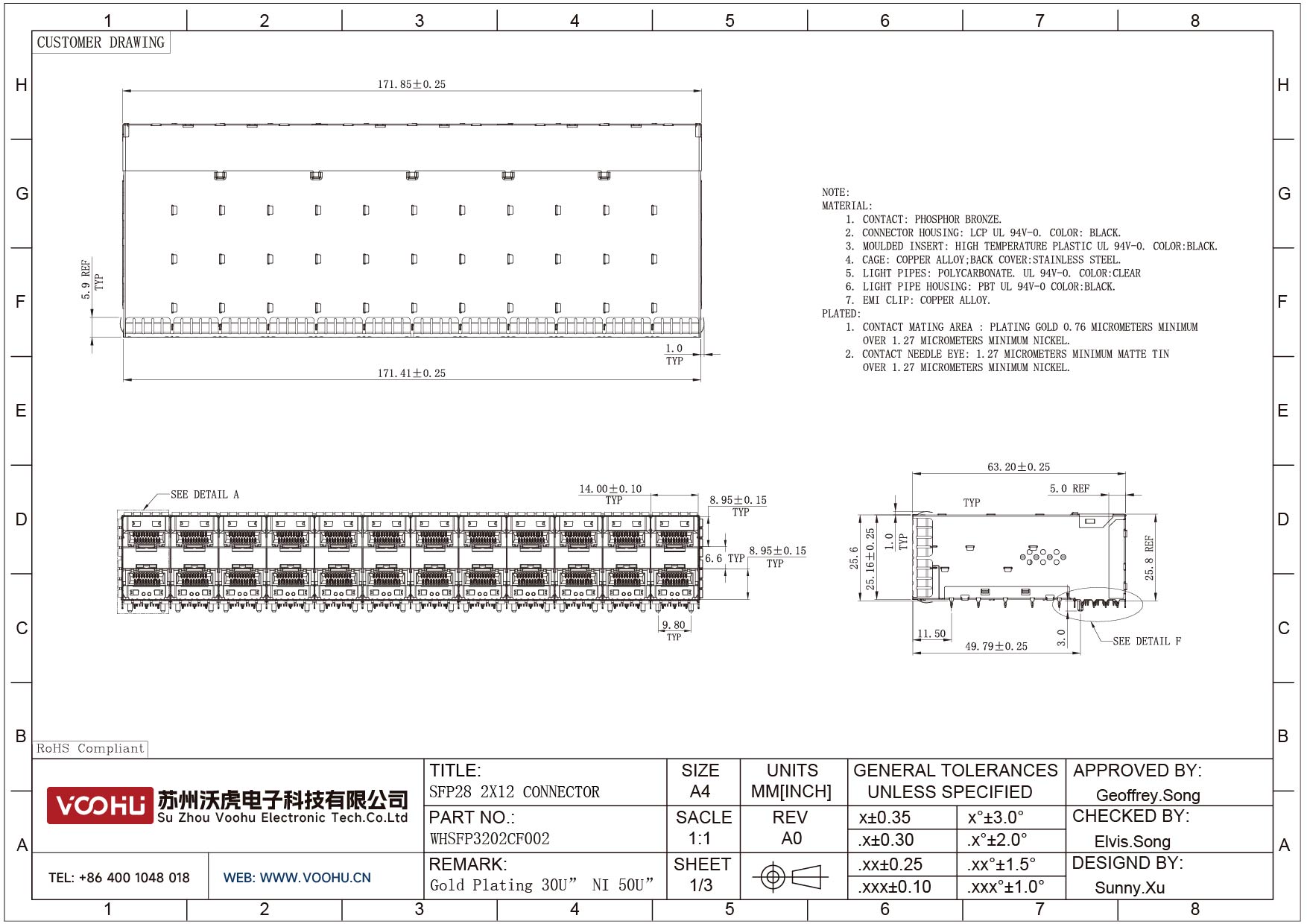 WHSFP16228F015 SFP+ 2×8 10G Press-Fit Cage+Connector SFP镀金厚度30U 镀镍 30U 光纤笼子