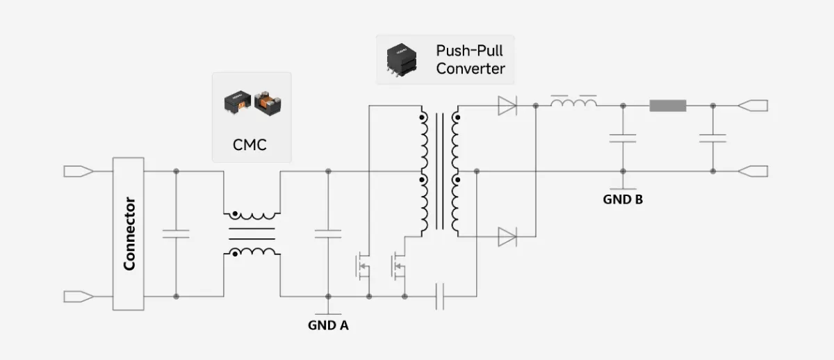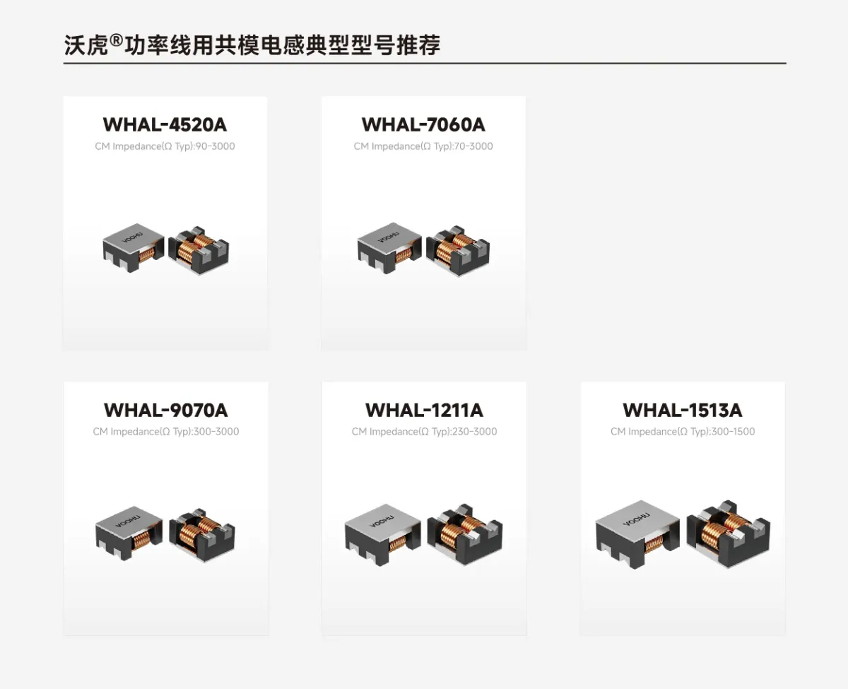 方案在功率输入端配置共模电感(CMC)作为输入滤波器,用于抑制来自电网或前级电源的共模干扰信号。目前可提供的功率共模电感包括7060、9070及1211系列,不同尺寸与电感量对应不同的额定电流与滤波特性,设计人员可根据实际功率等级进行选型。输入滤波的目的是保证进入开关器件的电流质量,为后续电路提供相对纯净的输入能源。
