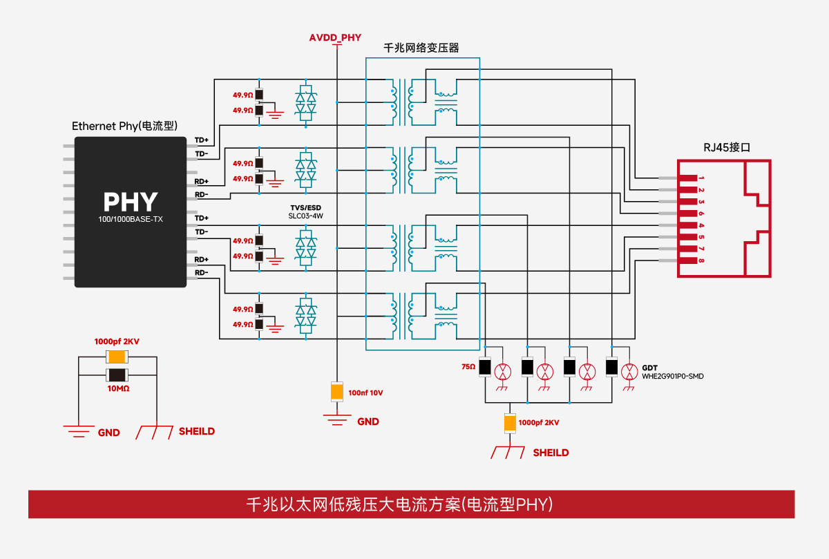 •VCC供电:对于电流型PHY,初级线圈需要连接到PHY的VCC,以滤除高频噪声,确保信号的稳定性。推荐在每组差分对中间并联两颗49.9Ω电阻,并接入GND。