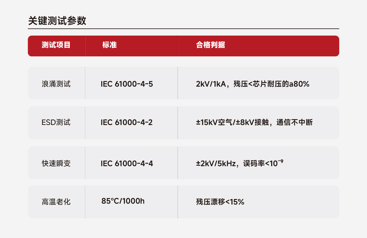 - 大电流:指保护器件能瞬时通过高浪涌电流(通常>50A,8/20μs波形),快速泄放能量