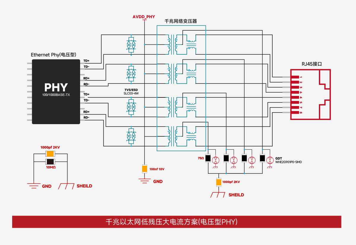 •VCC供电:对于电流型PHY,初级线圈需要连接到PHY的VCC,以滤除高频噪声,确保信号的稳定性。推荐在每组差分对中间并联两颗49.9Ω电阻,并接入GND。
