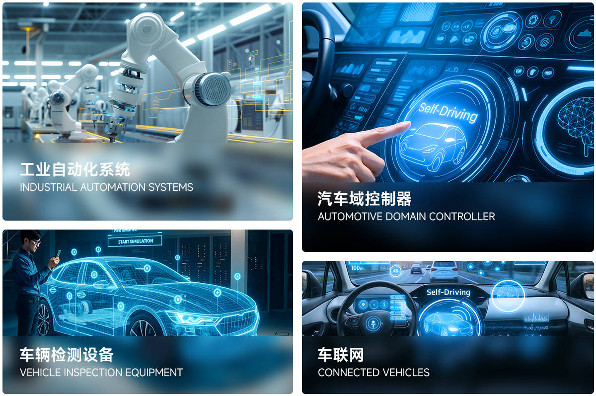 该设计适用于汽车及小体积智能化工业领域,具有出色的 EMI/EMC 和 ESD 性能,满足汽车和工控领域抗干扰和低功耗的需求。具备显著线程成本降低、电路设计轻量化、通信效率高、通信质量稳定等优势,已广泛应用于汽车域控制器、车联网、车辆检测设备、工业自动化系统、机械臂等设备上。