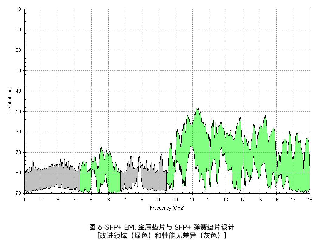 下图显示了 SFP+ 金属垫片设计相对于 SFP 弹簧夹设计的性能对比。绿色阴影区域表示弹性垫片的性能优于 SFP 弹簧夹。