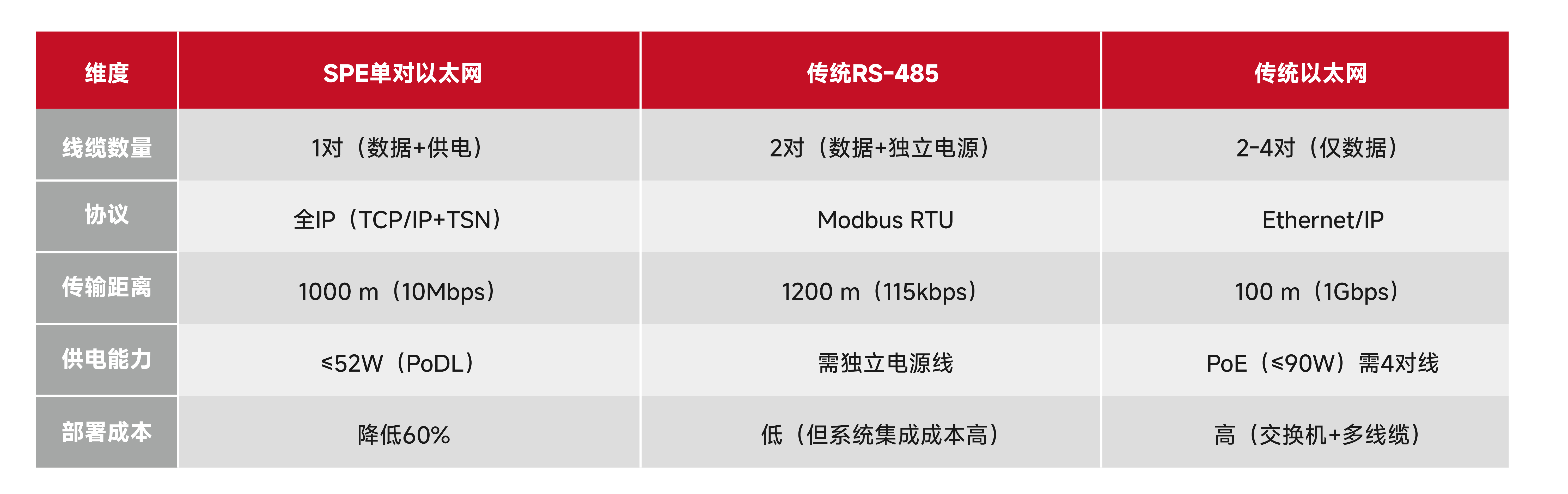 线缆数量减少75%,重量降低50%,安装效率提升60%(对比传统4线以太网)。