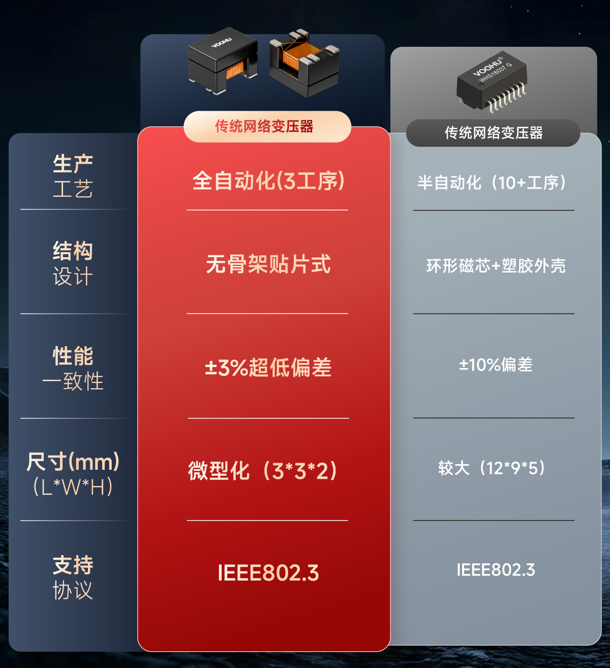 沃虎电子,引入领先的全自动化生产的新型片式网络变压器(Chip Lan)采取H+I结构、全自动化生产模式,突破传统环形绕线变压器、电感设计方案,实现规模性、全流程自动化生产。产品符合欧盟RoHS2.0规范、可与全球主要PHY芯片品牌供货商的产品兼容。