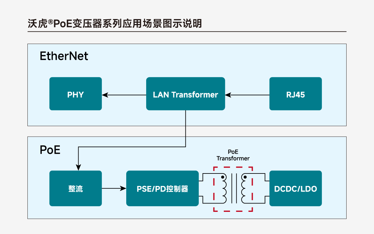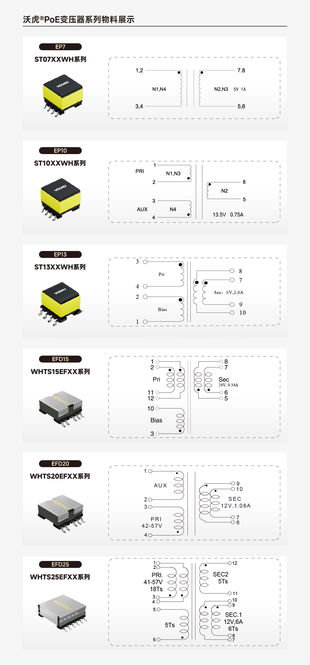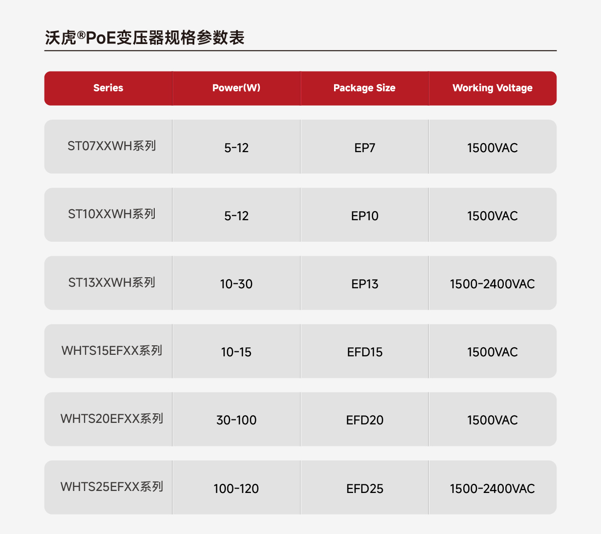 现有的系统大多采用符合IEEE802.3af(PoE)和IEEE802.3at(PoE+)标准要求的2对线端口输出,输出功率分别为15W和30W。沃虎电子还提供4对线供电PoE电源变压器,采用符合PoEbt标准的输出,可为设备提供更高功率输出。