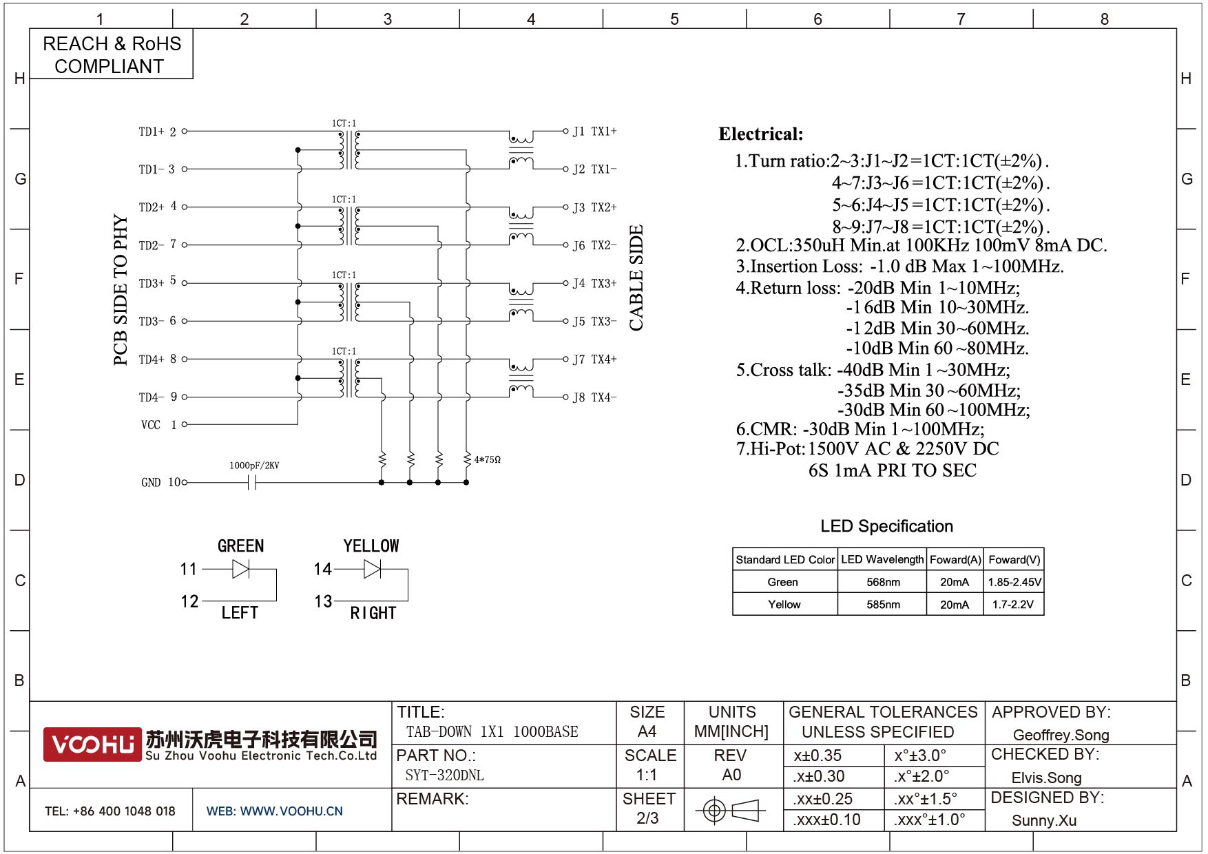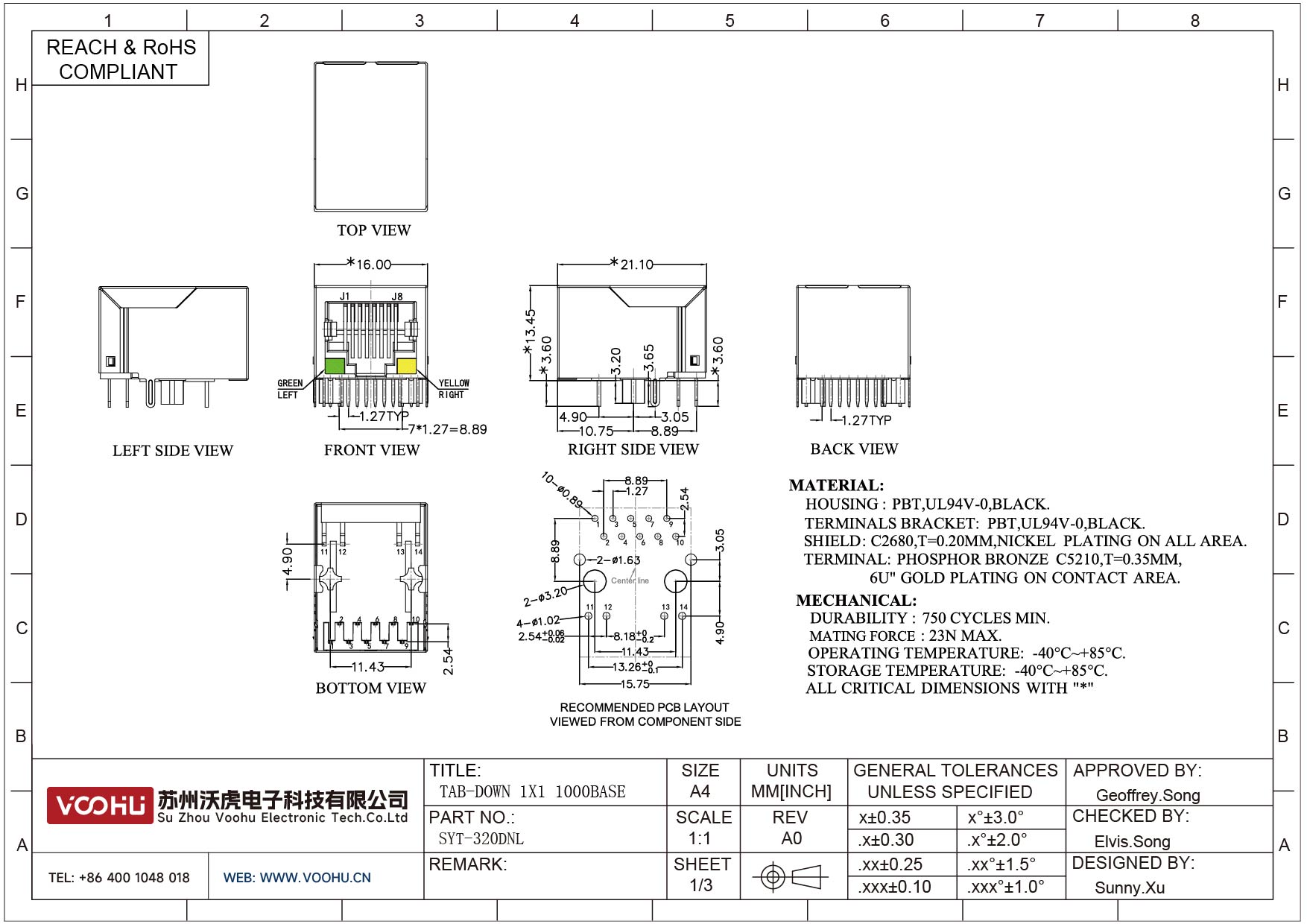 SYT-320DNL 90° 侧面插入 1*1 开口朝下 1000Base LED G/Y DIP RJ45
