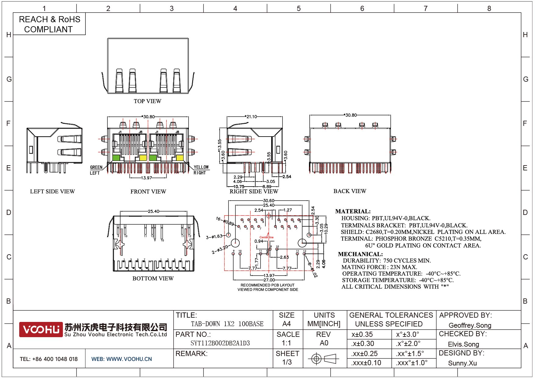 SYT112B002DB2A1D3 90° 侧面插入 1*2 开口朝下 10/100M LED G/Y DIP RJ45