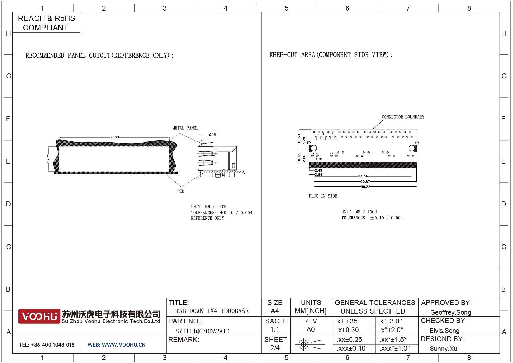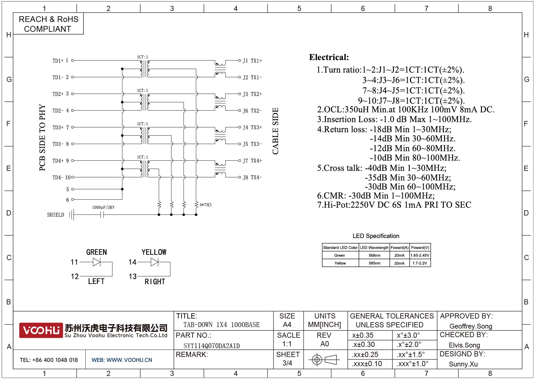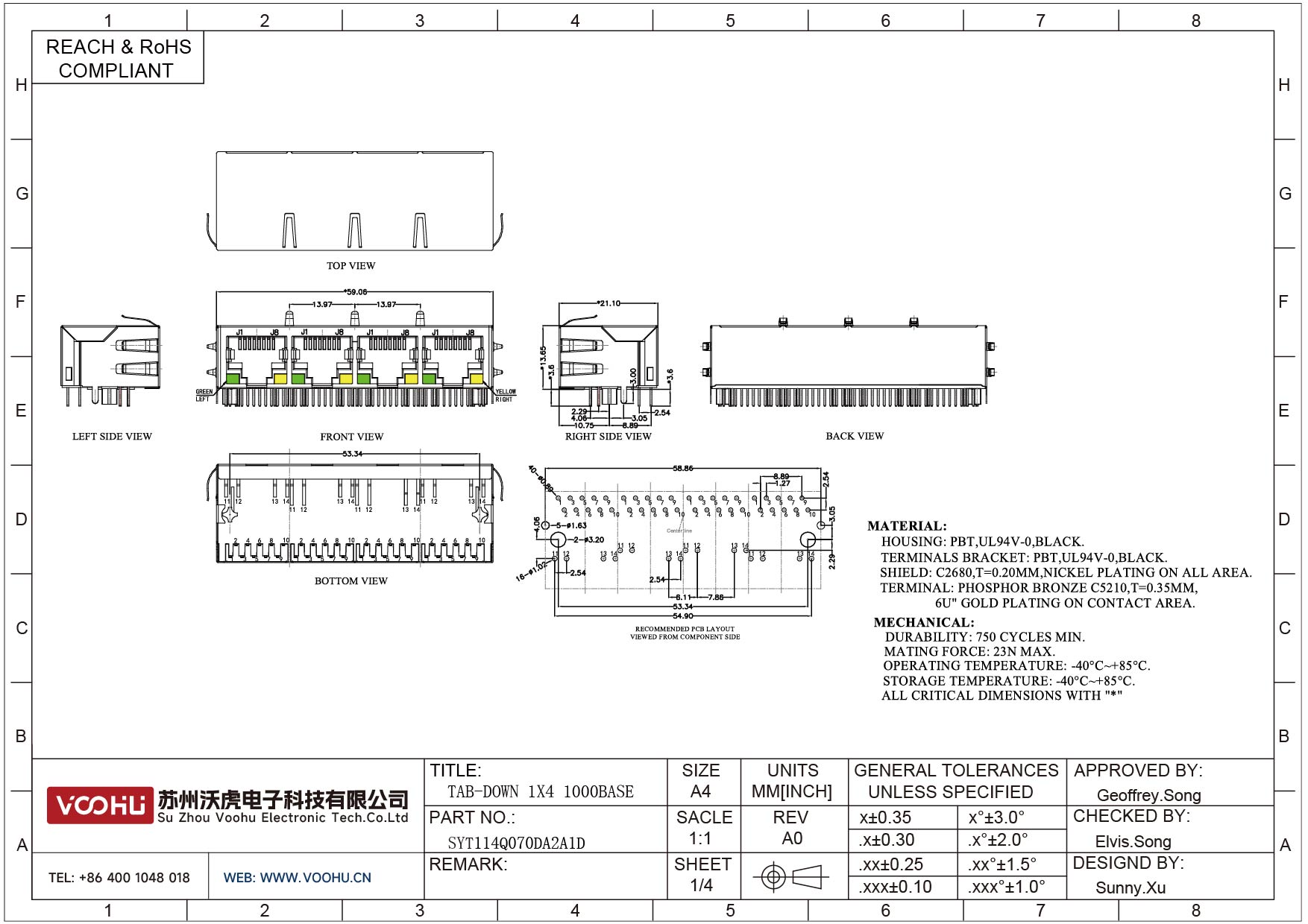SYT114Q070DA2A1D 90° 侧面插入 1*4 开口朝下 100/1000M LED G/Y DIP RJ45