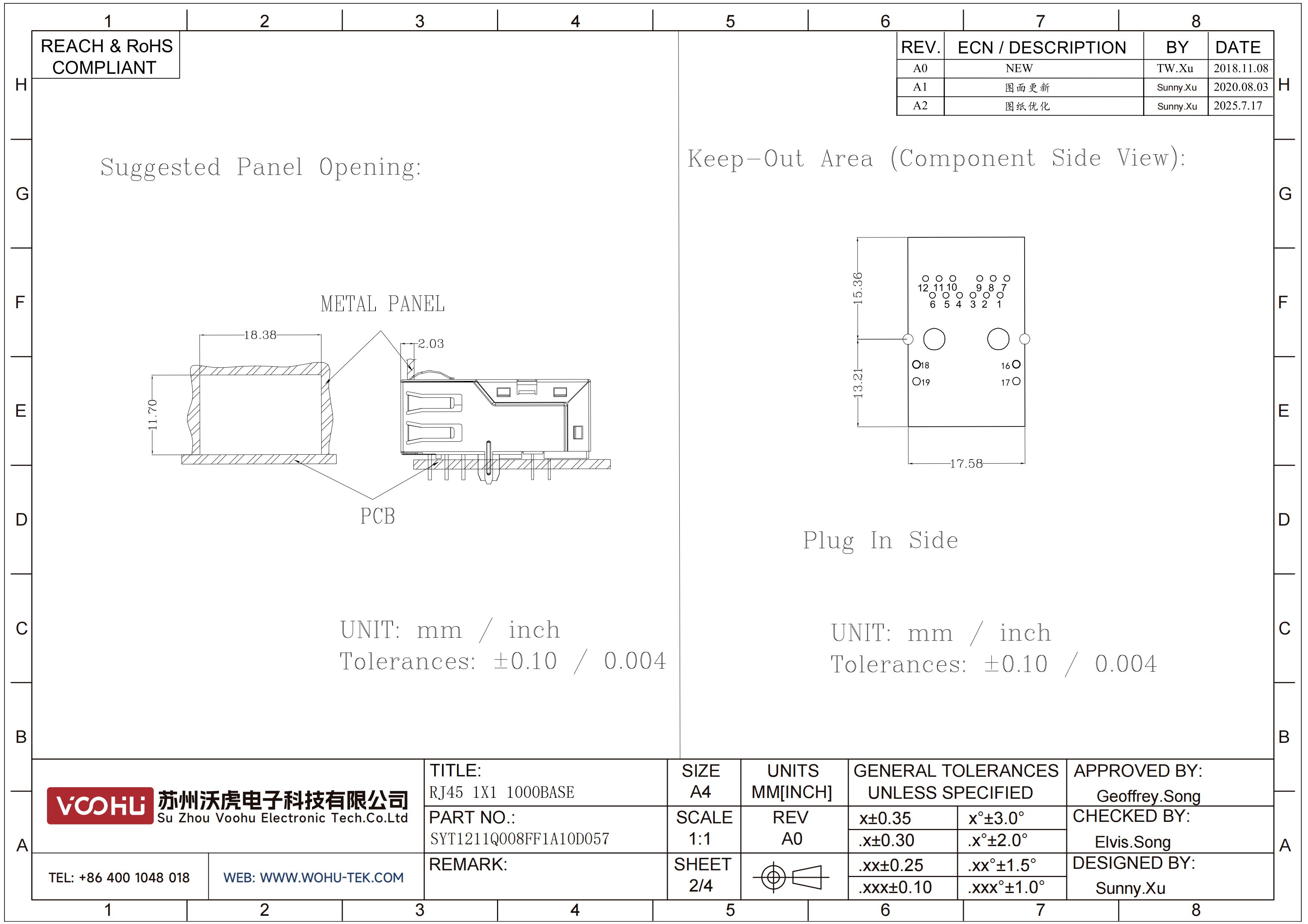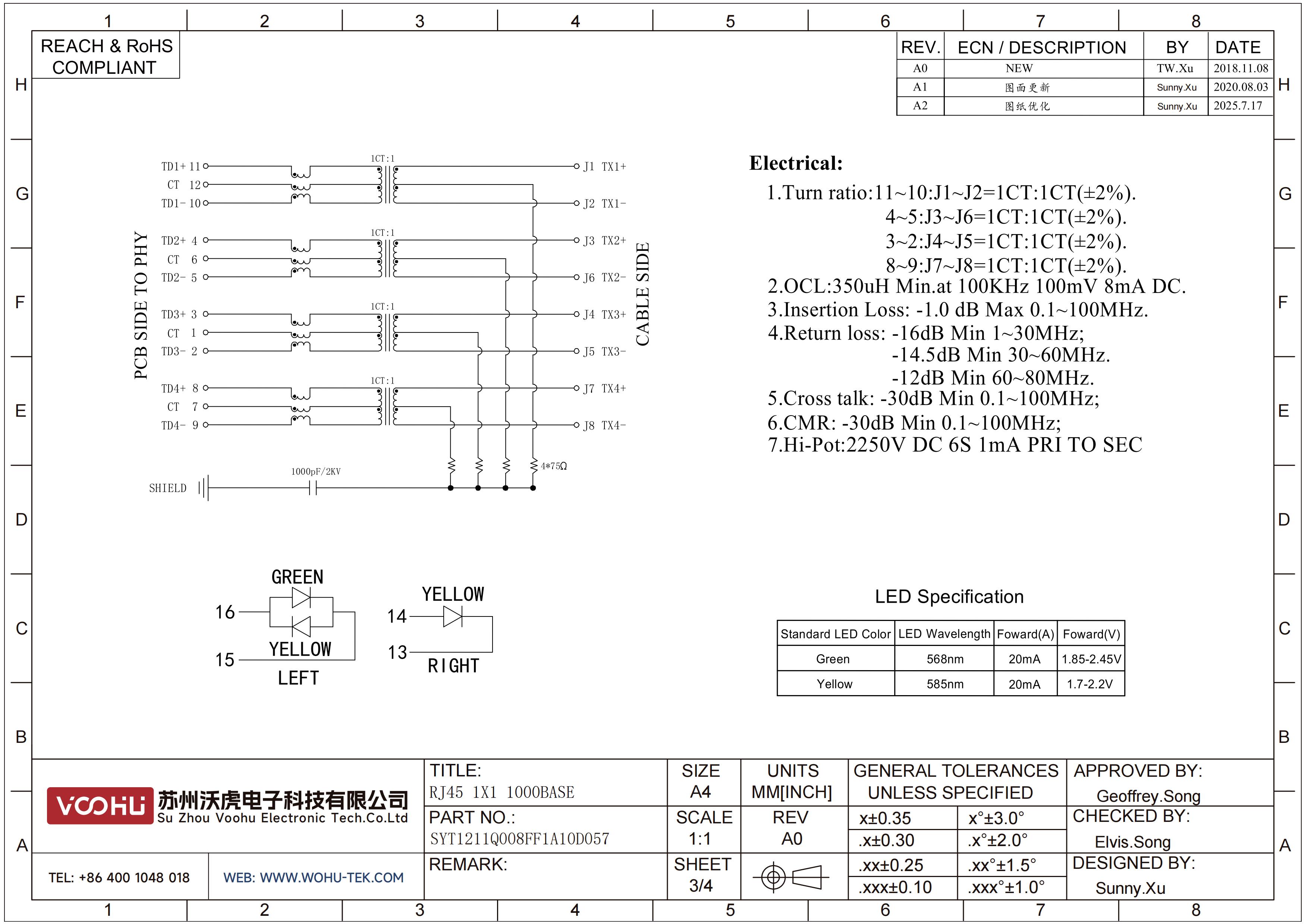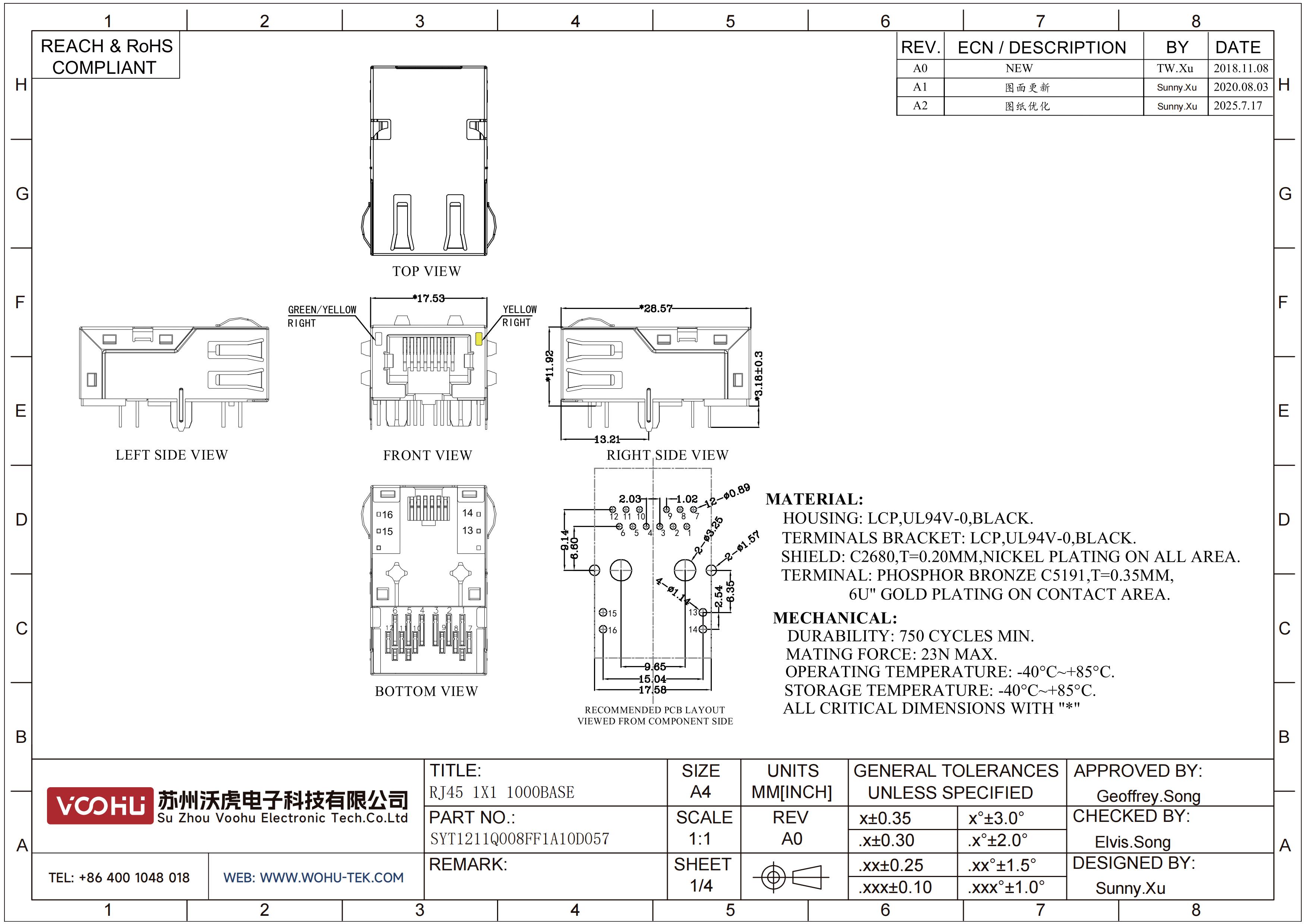 SYT1211Q008FF1A10D057 90° 侧面插入 1*1 开口朝下 100/1000M LED GY/Y DIP RJ45(低高度)