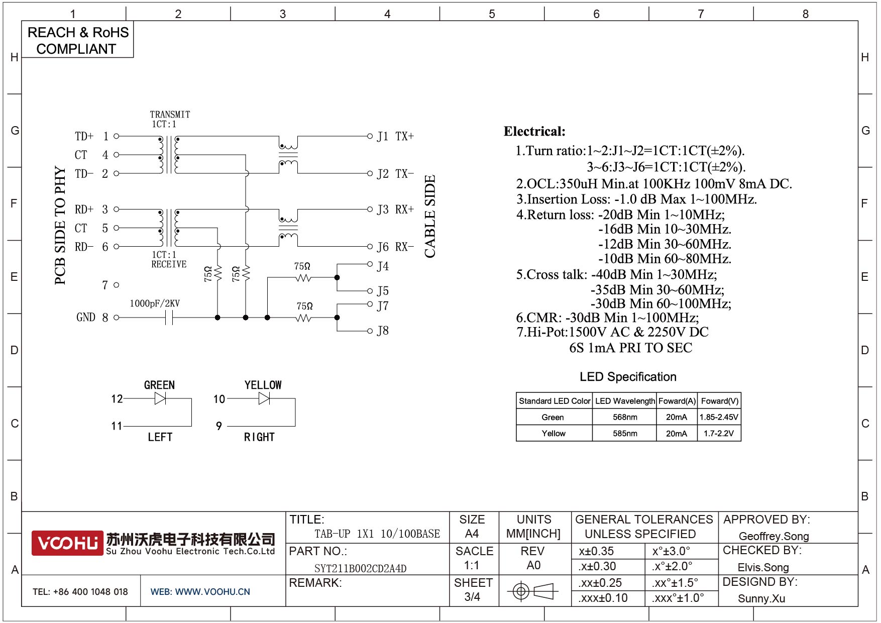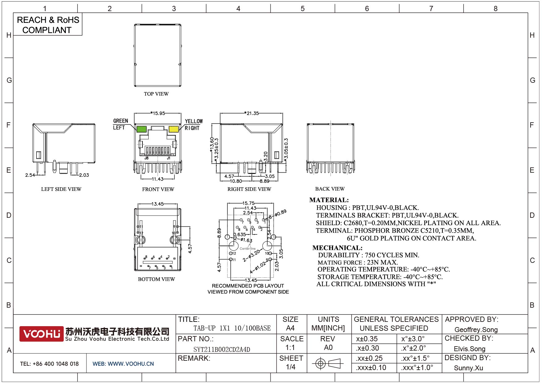 SYT111B002BA2A1D 90° 侧面插入 1*1 开口朝下 10/100M LED G/Y 带屏蔽 DIP RJ45