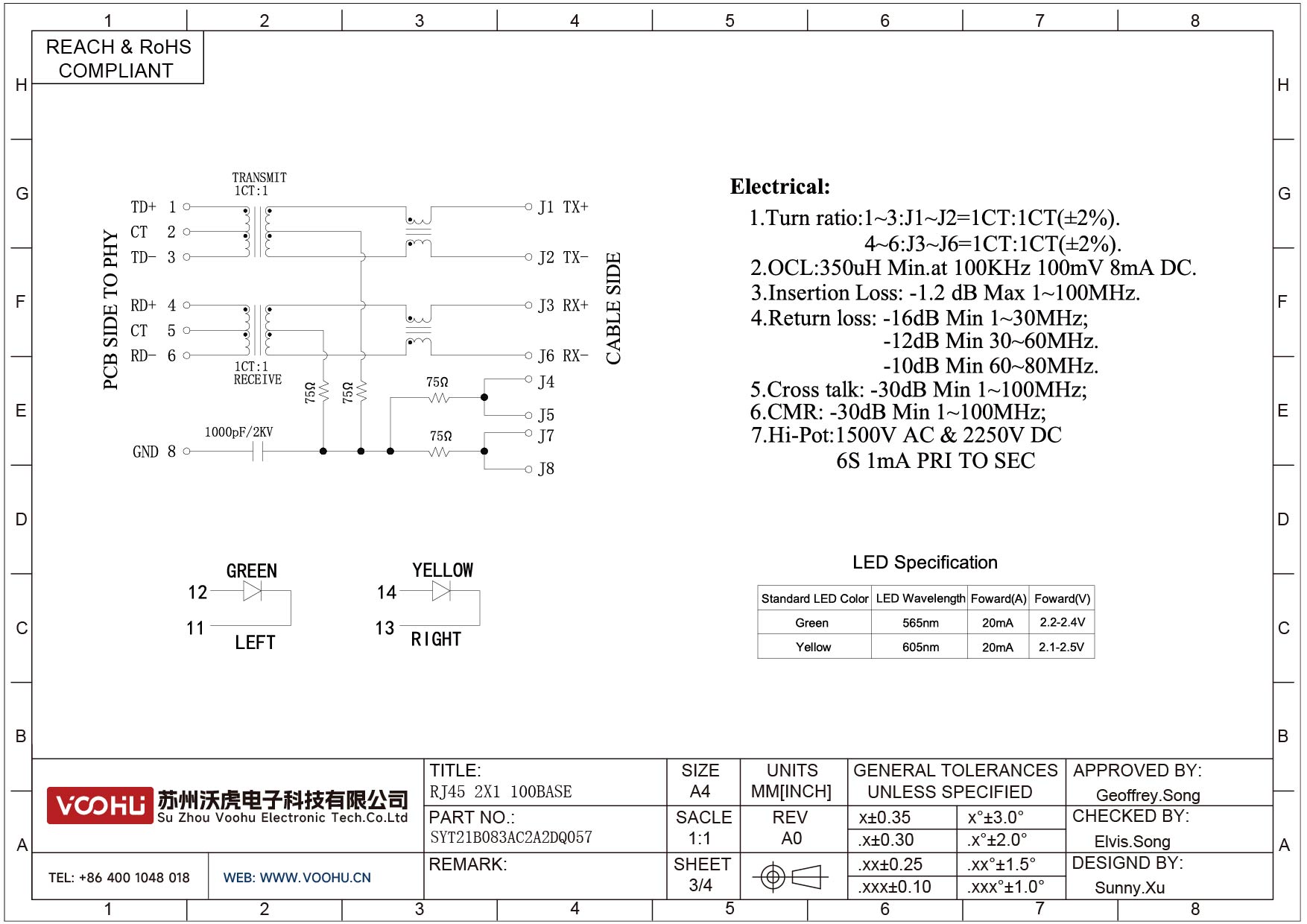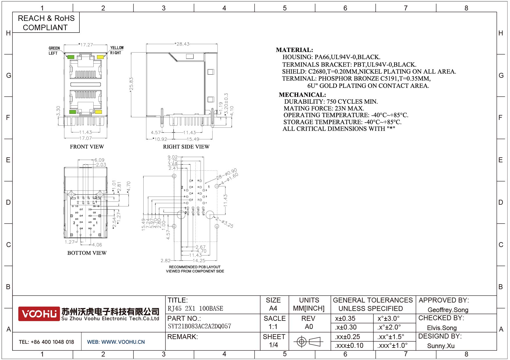SYT21B083AC2A2DQ057 90° 侧面插入 2*1 开口朝上/下 10/100M LED G/Y DIP RJ45