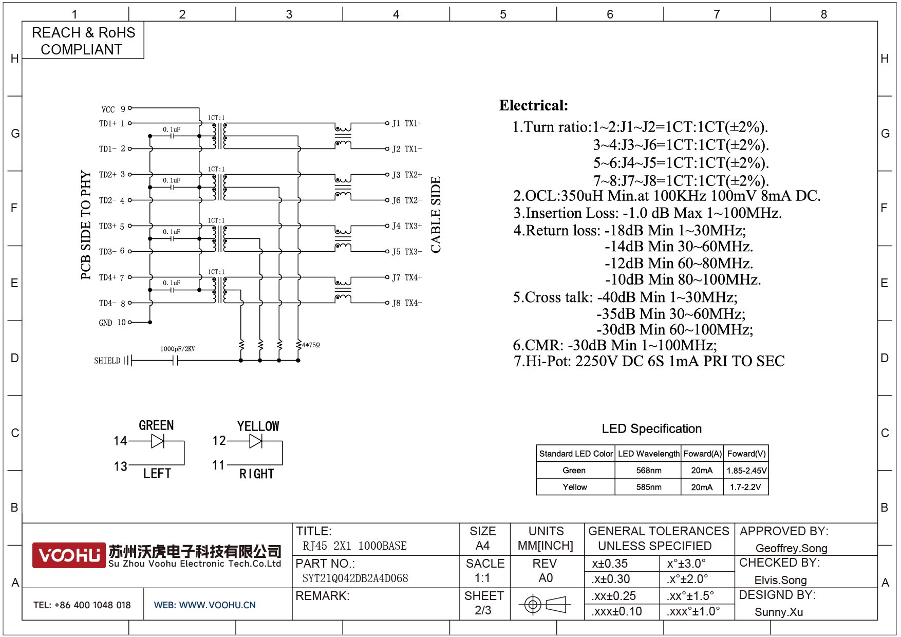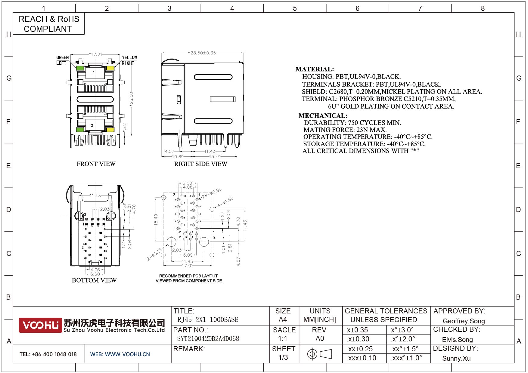 SYT21Q042DB2A4D068 90° 侧面插入 2*1 开口朝上/下 100/1000M LED G/Y DIP RJ45