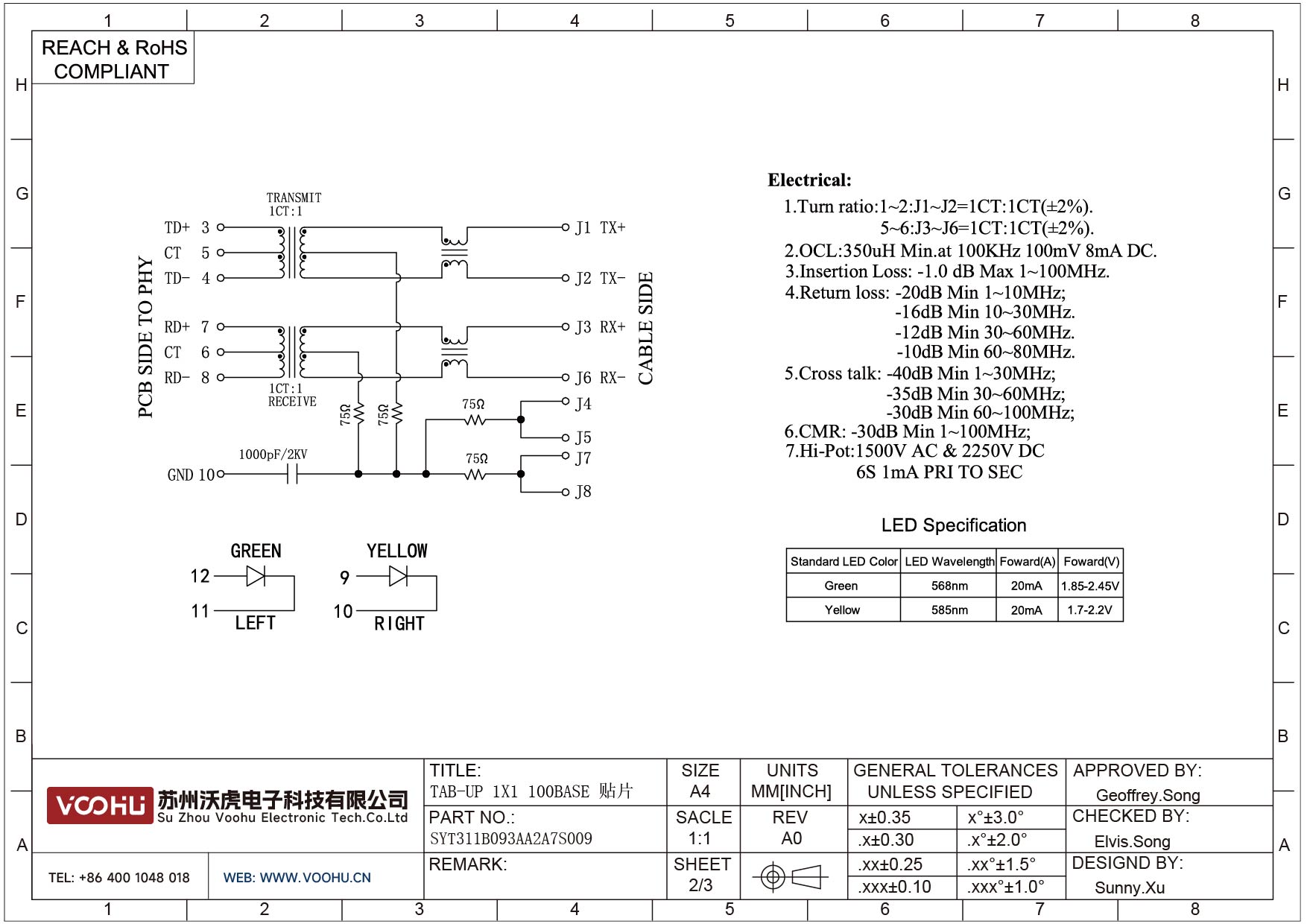 SYT311B093AA2A7S009 90° 侧面插入 1*1 开口朝上 10/100M LED G/Y SMD RJ45