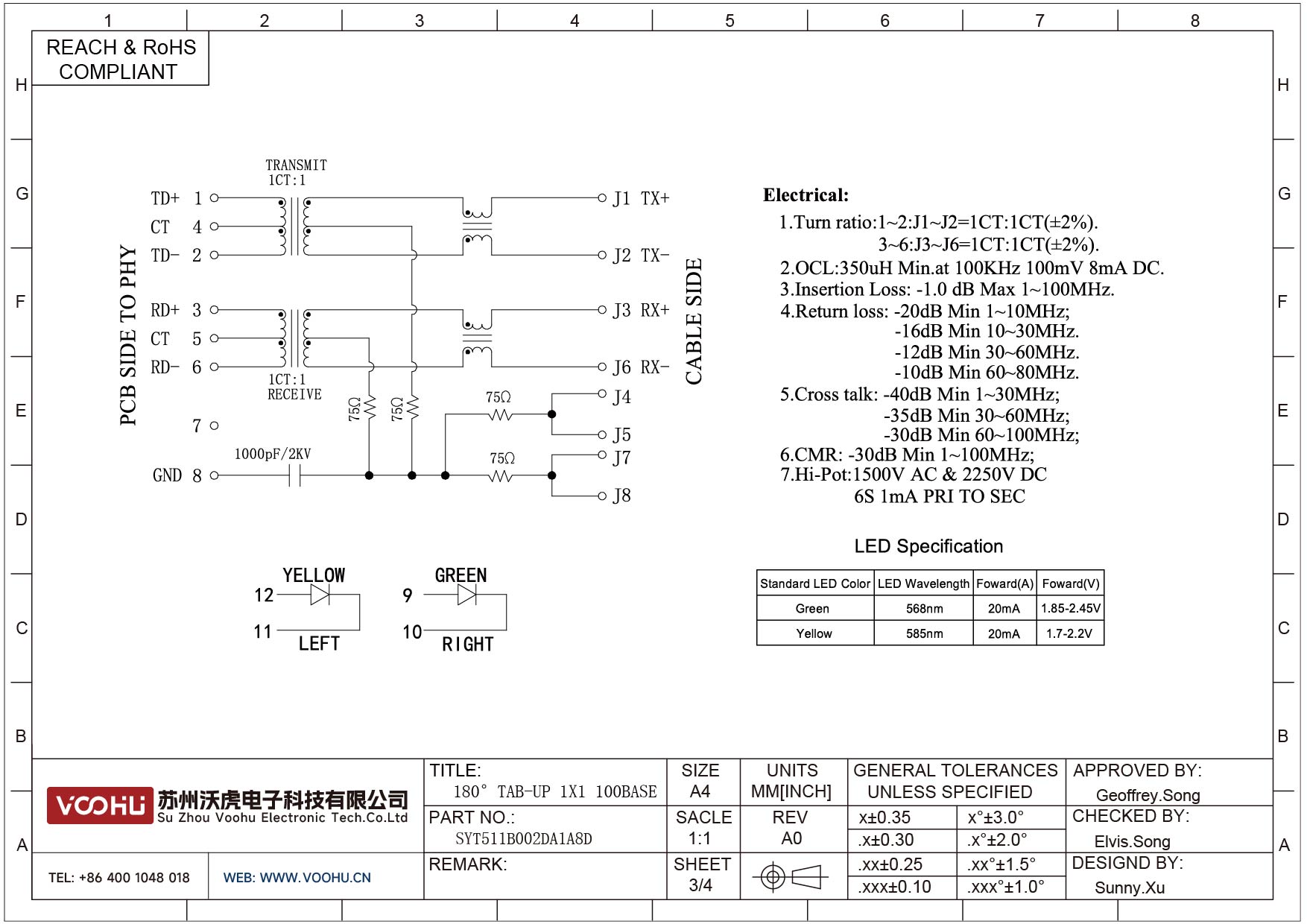 SYT212B579CD2A4D 90° 侧面插入 1*2 开口朝上 10/100M LED G/Y DIP RJ45