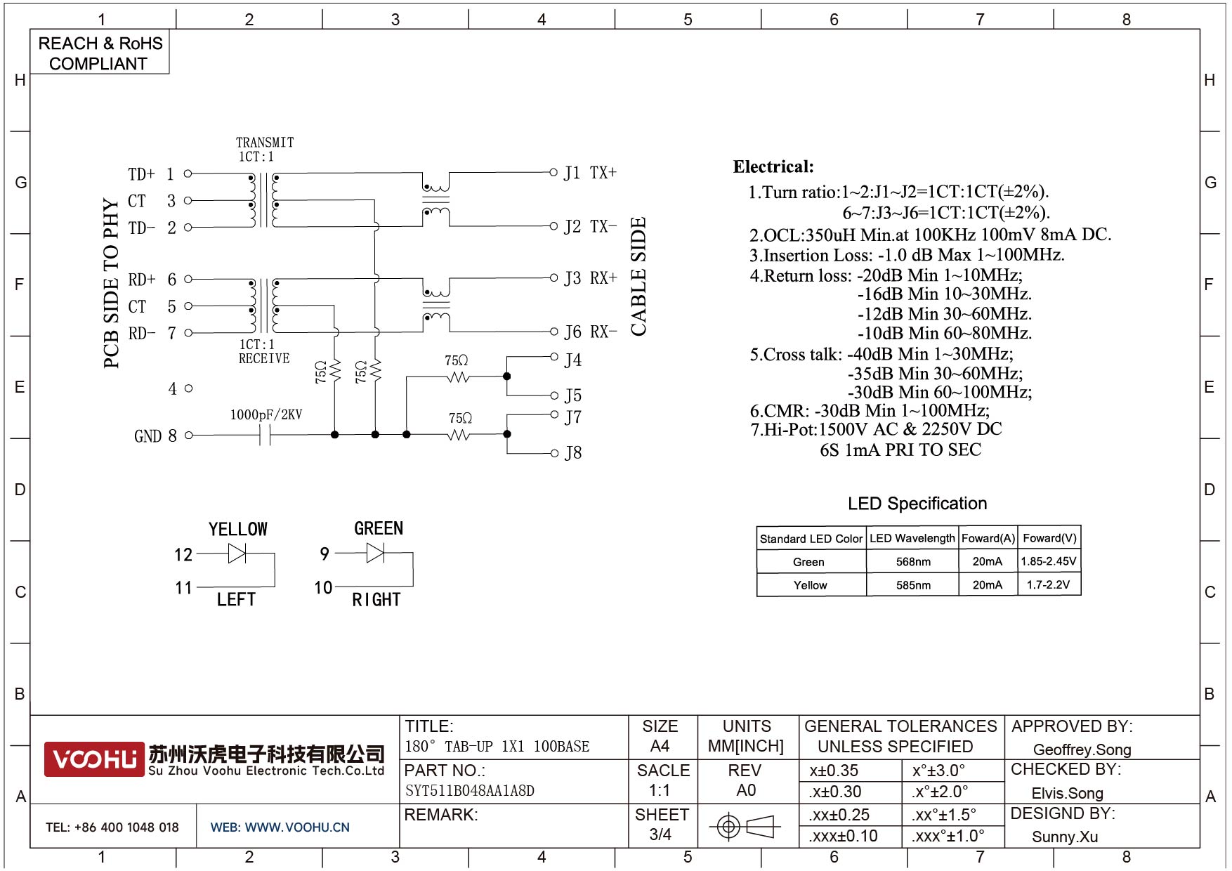 SYT511B048AA1A8D 180°立式 1*1 开口朝上 10/100M LED Y/G DIP RJ45