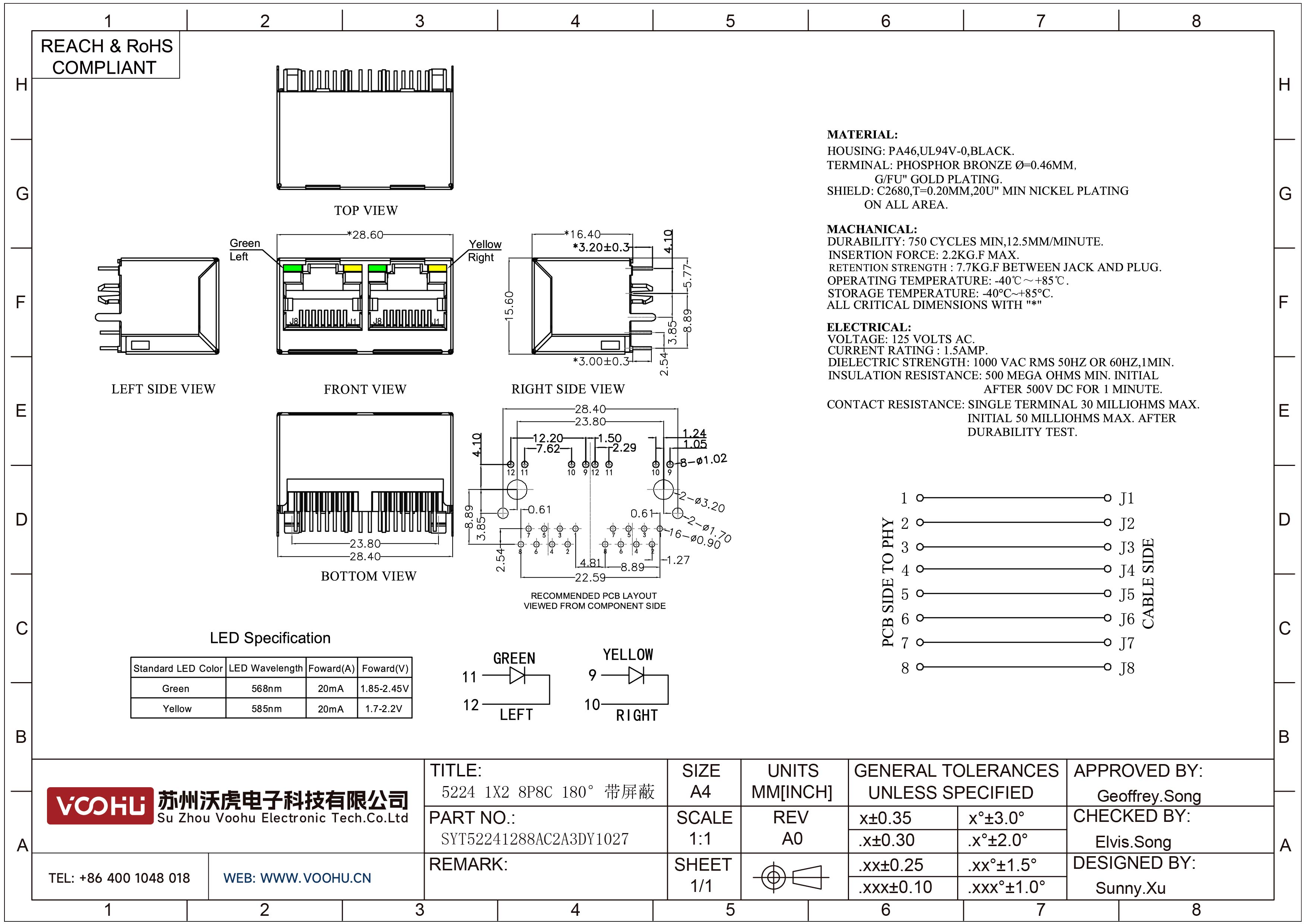 SYT52241288AC2A3DY1027 180°立式 1*2 开口朝上 LED 左绿右黄 DIP RJ45