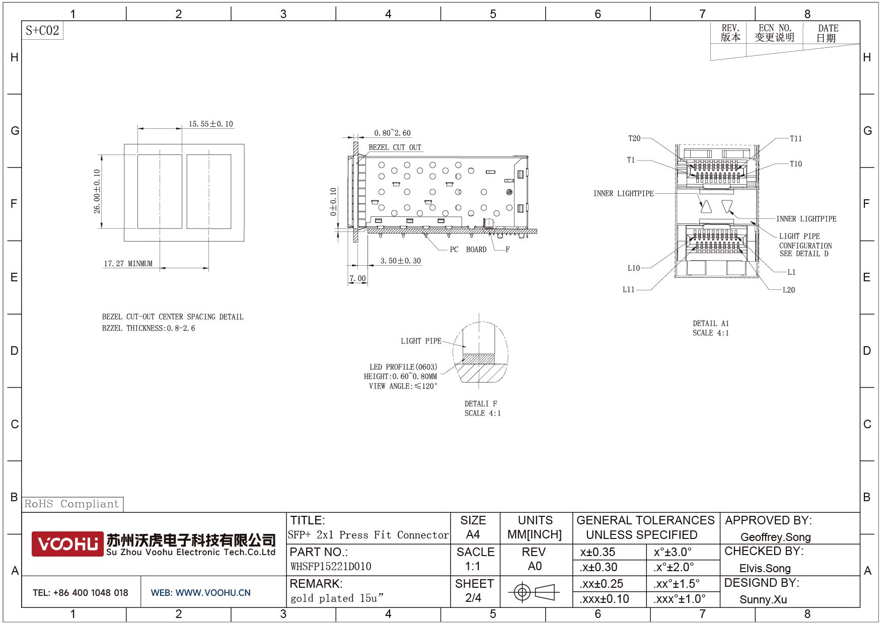WHSFP15221D010 SFP+ 2×1 10G Press-Fit Cage+Connector SFP镀金厚度15U 光纤笼子
