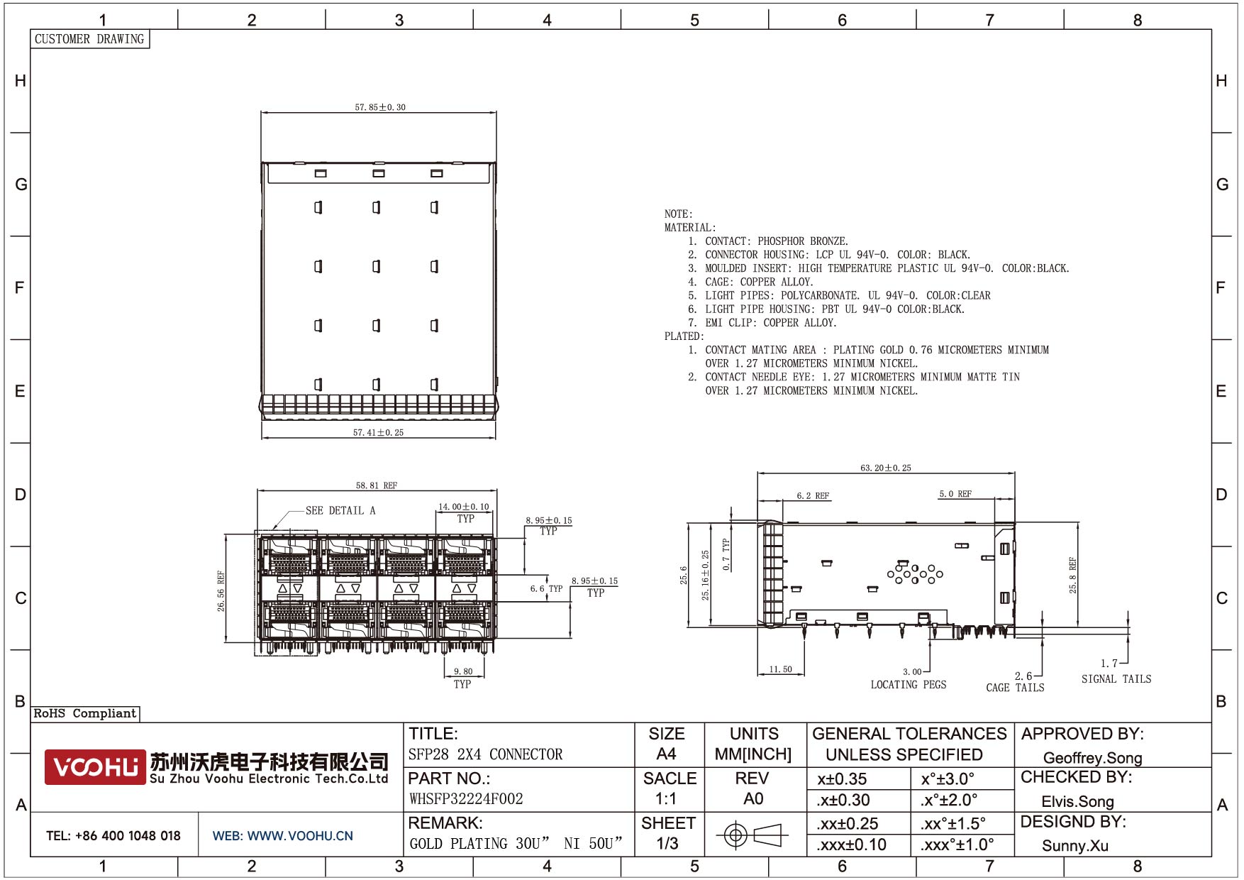 WHSFP32224F002 SFP28 2×4 25G Cage+Connectors 光纤笼子