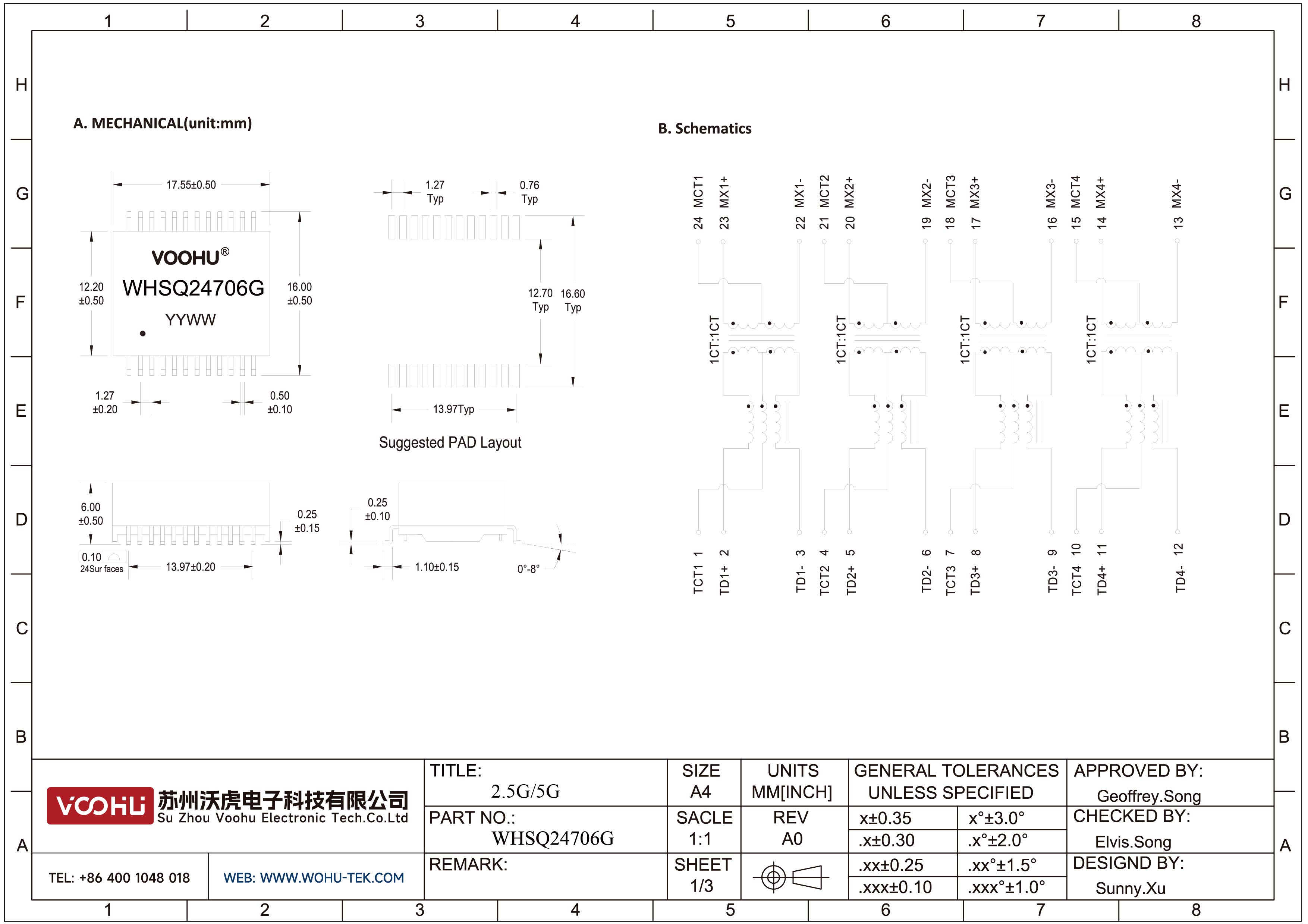 WHSQ24706G 单口 SMD 2.5G/5G PIN24 以太网变压器